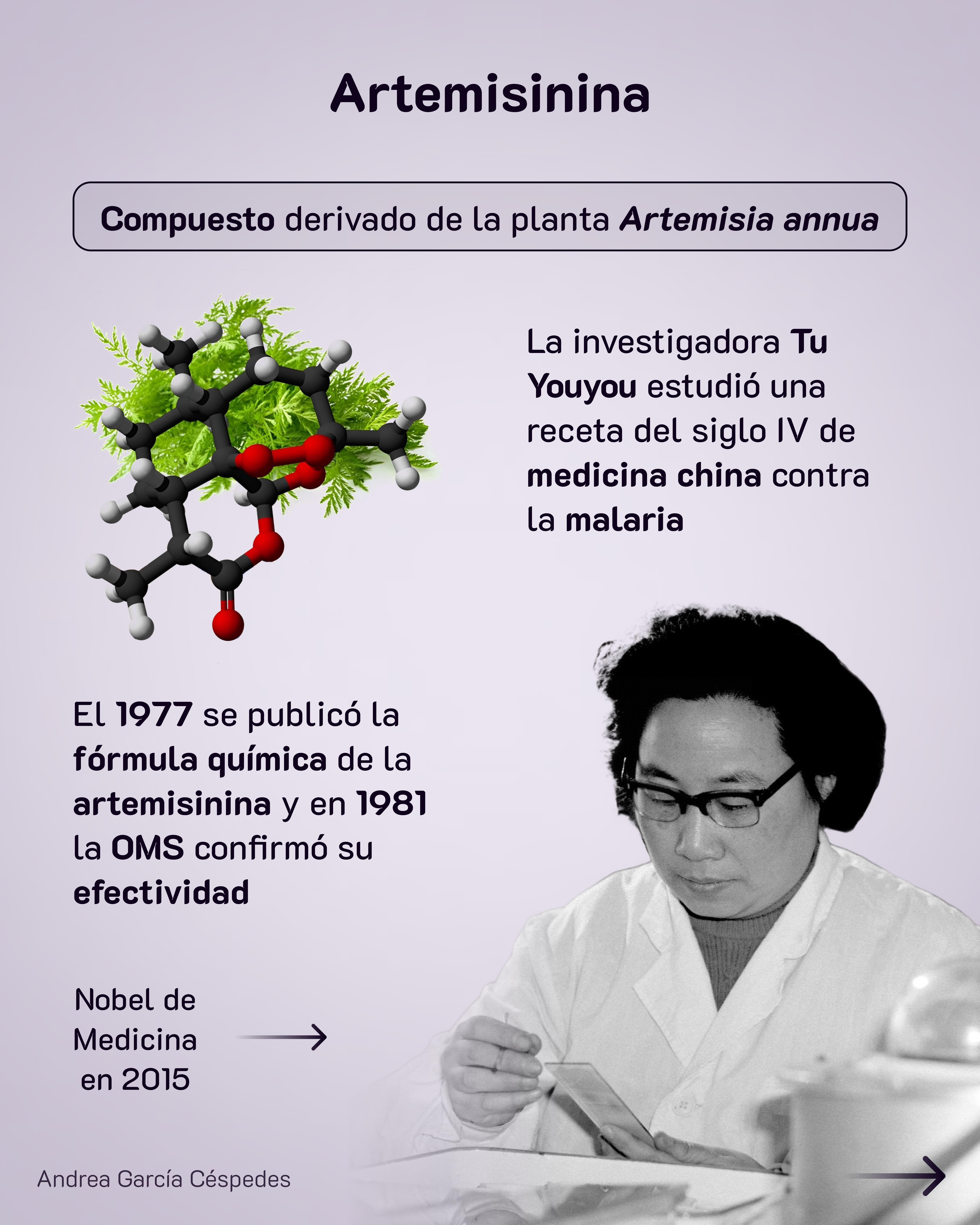 Su grupo comenzó a buscar antiguas recetas chinas que se habían usado para tratar la fiebre y síntomas de la malaria. Y encontraron que una de las plantas más frecuentemente utilizadas era la Artemisia annua. Vieron que extractos de esta planta mostraban actividad antipalúdica, pero con cierta variabilidad.
