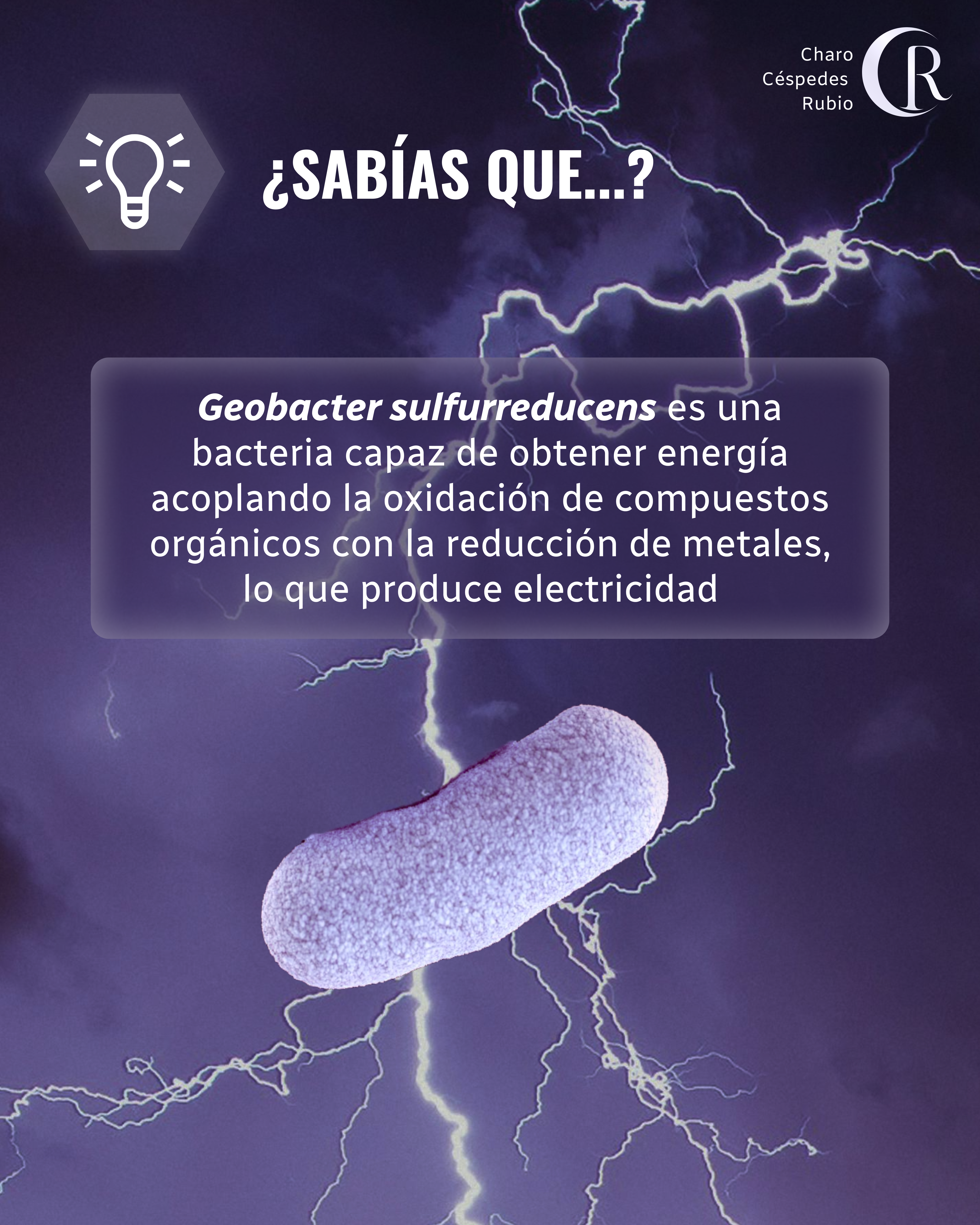 Geobacter sulfurreducens, es una bacteria Gram negativa que vive en sedimentos acuáticos, no necesita oxígeno y, como parte de su metabolismo, libera electrones.