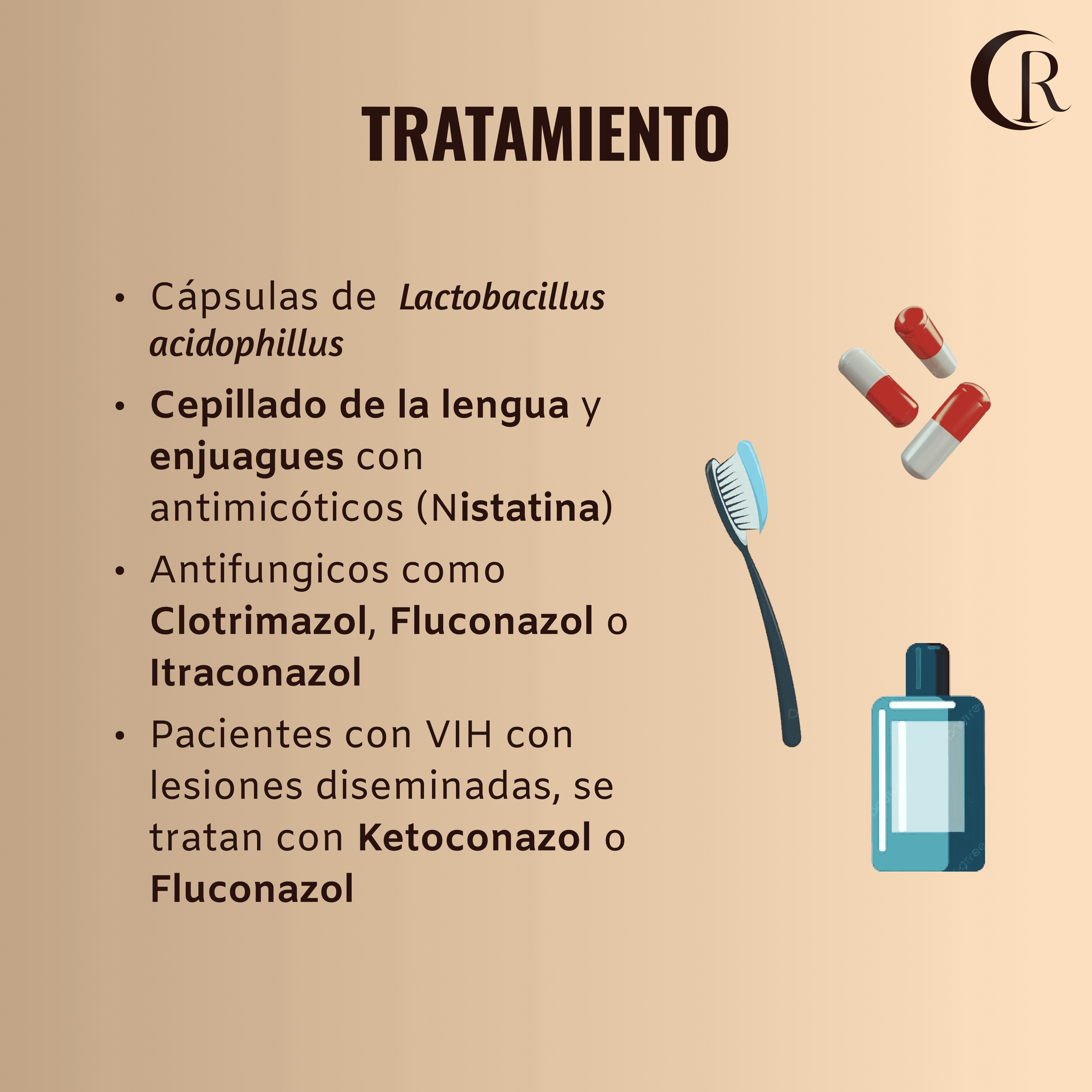 Cepillar la lengua y hacer enjuagues con agua oxigenada diluida al 3 % varias veces al día o enjuagues antimicóticos (Nistatina)
