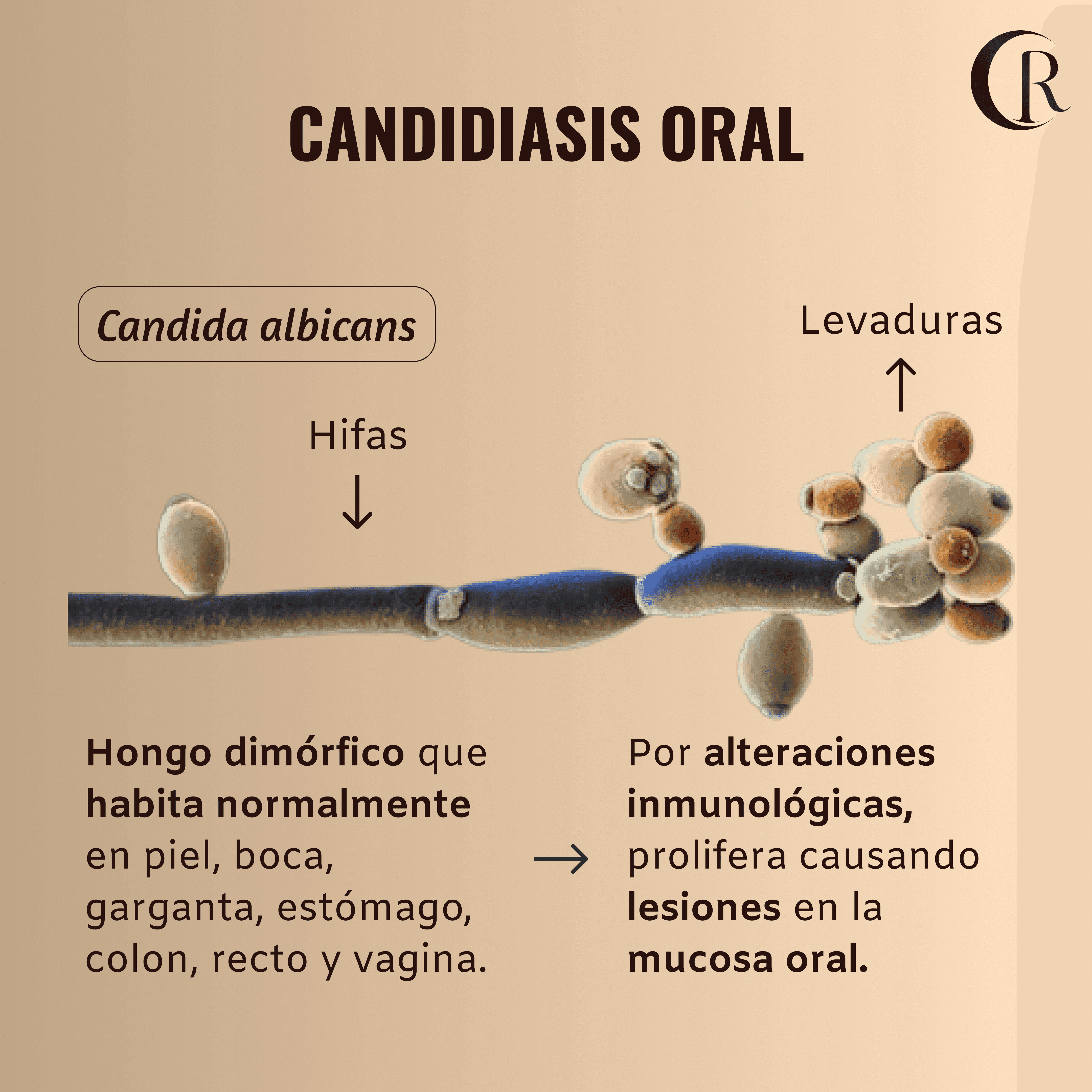 Este hongo pertenece al filo Ascomycota, es dimórfico (con forma de levadura o de hifa) y habita de manera natural en la cavidad oral. Pero cuando el sistema inmunológico se deprime, se multiplica su crecimiento causando la infección.