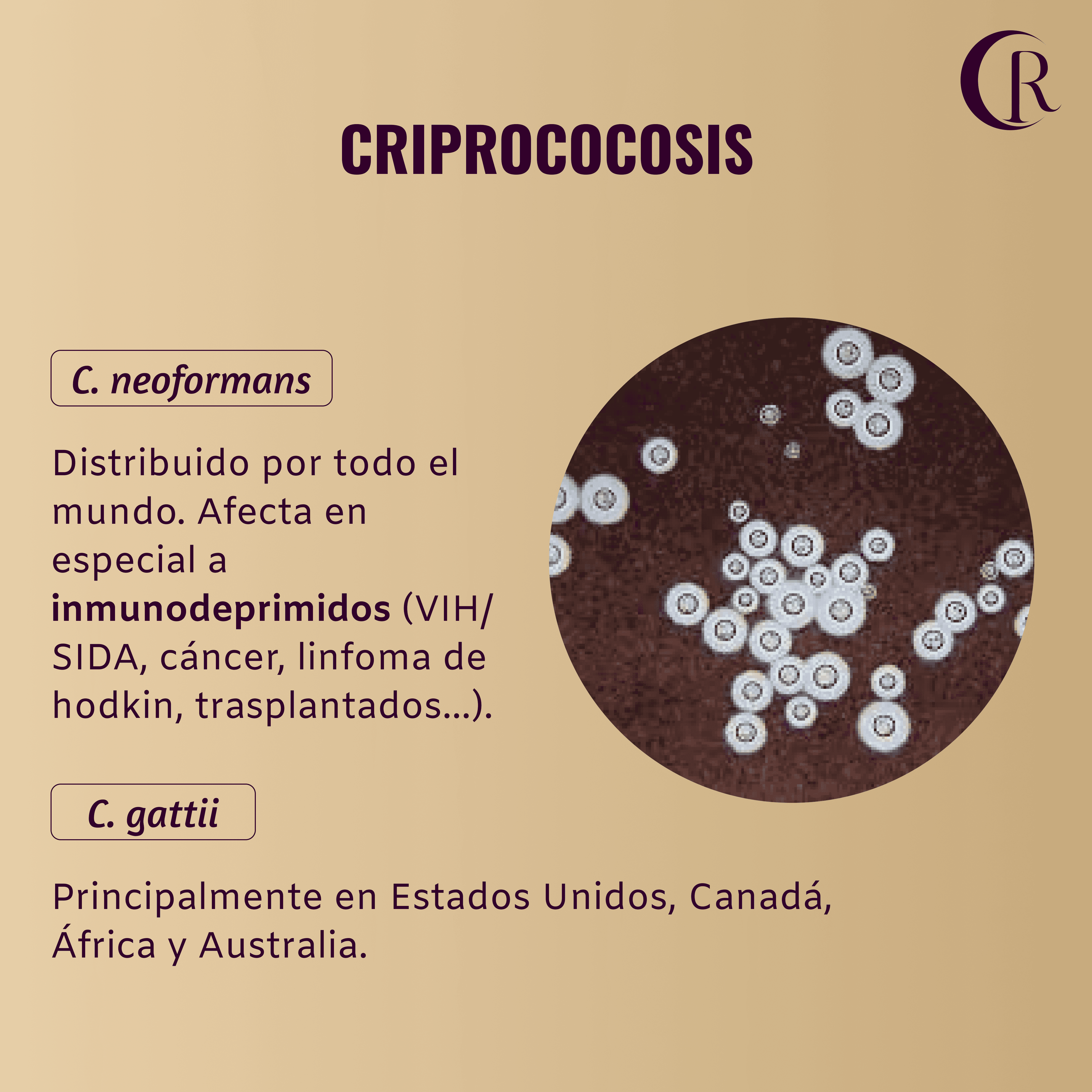 El C. neoformans está más distribuido y afecta en especial a personas inmunodeprimidas (VIH/SIDA, cáncer, linfoma de Hodgkin, trasplantados…). Forma esporas que en condiciones del anfitrión como glucosa baja, bajo contenido de hierro, entre otras, produce una cápsula polisacárida característica.