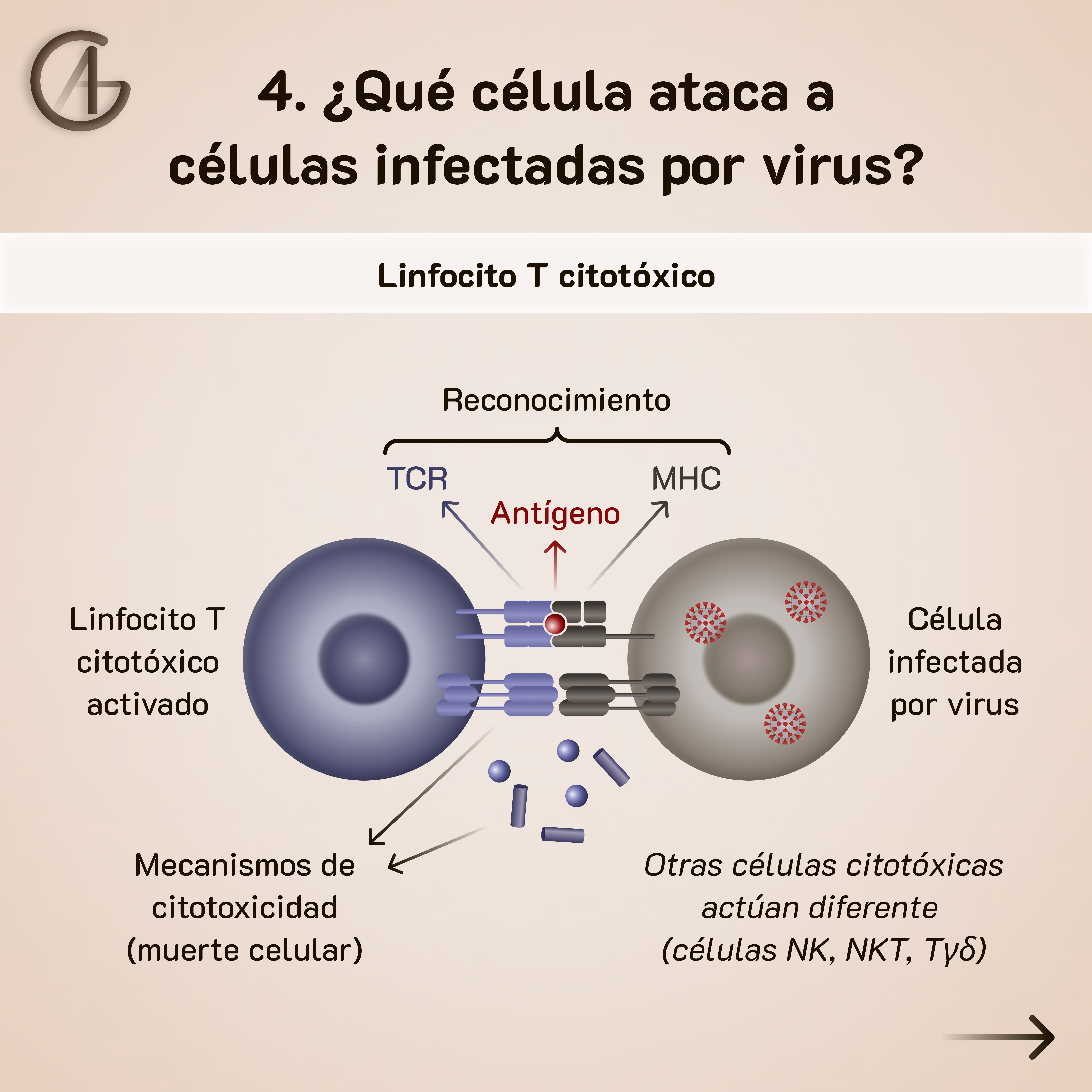 Esto permite la activación de distintas células (linfocitos T citotóxicos, NK, NKT y Tγδ), cada uno de diferente manera. Estás células atacan a la infectada mediante citotoxicidad.