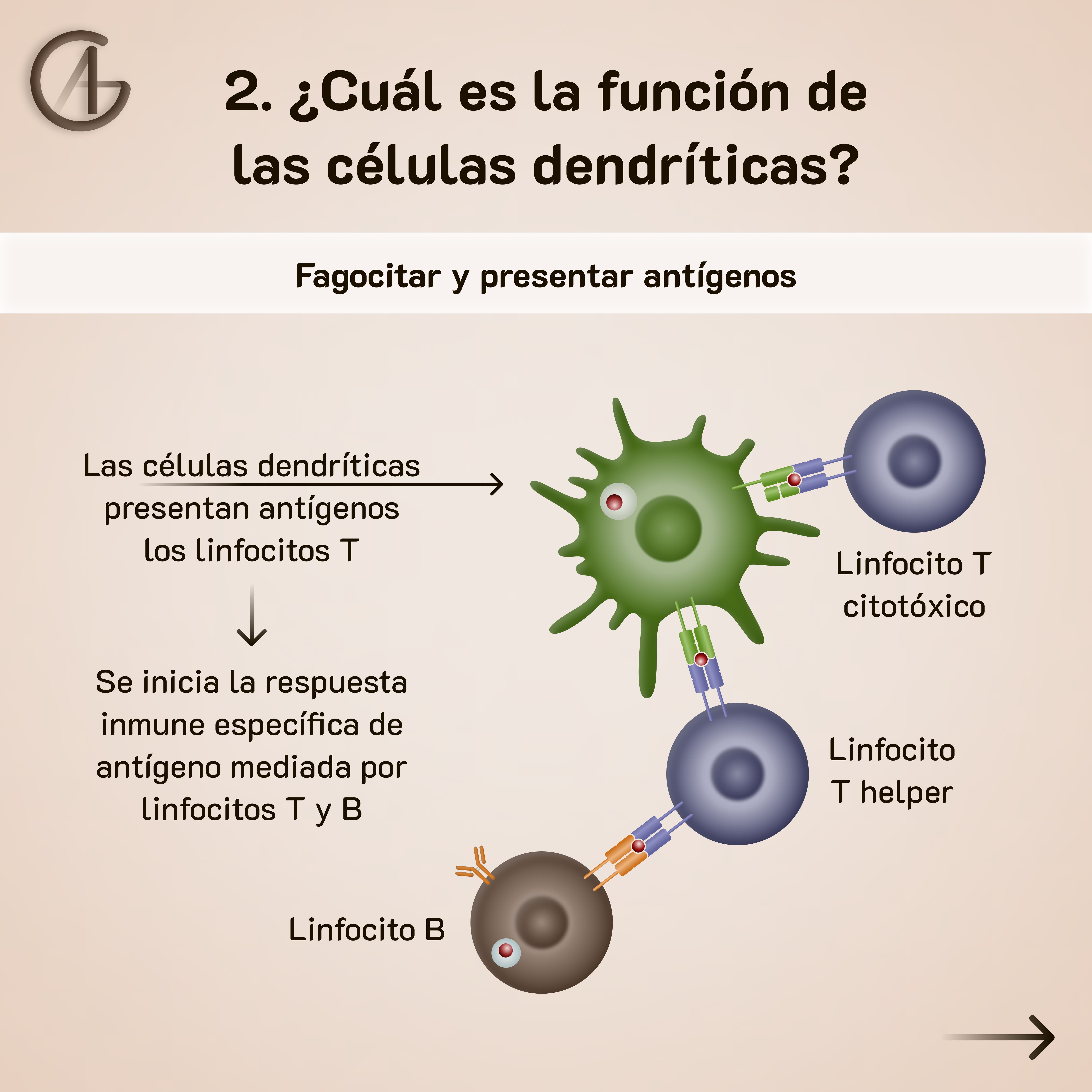 Las células dendríticas son células presentadoras de antígeno profesionales. Se encargan de fagocitar antígenos extraños, procesarlos y presentar sus fragmentos en su superficie unidos al MHC (Complejo Mayor de Histocompatibilidad).