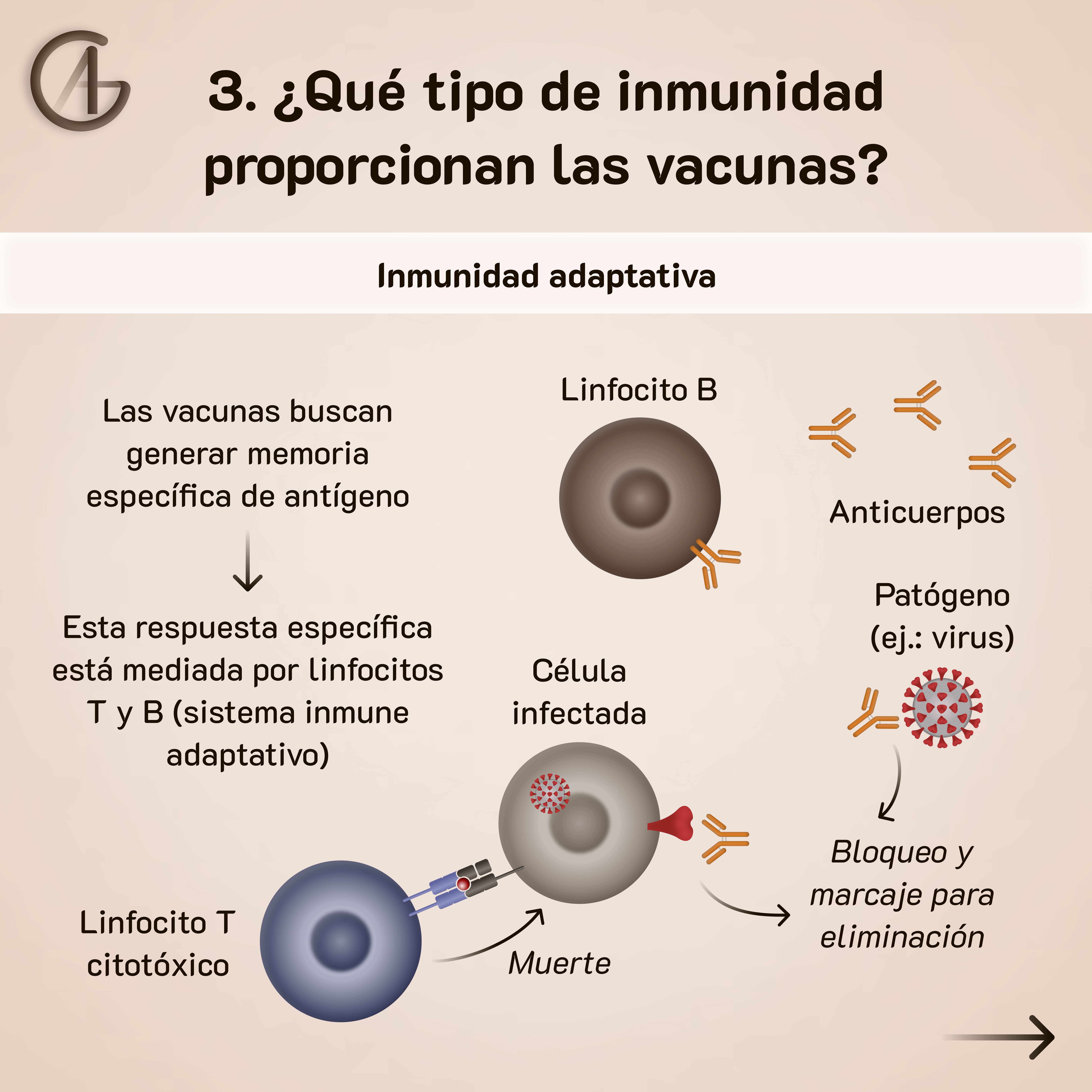 Luego conecta con la inmunidad adaptativa, que sí es específica y que está mediada por linfocitos T y B. Estás células proliferan para atacar al patógeno y una parte permanece como células de memoria para actuar más rápido y mejor ante un segundo contacto con el patógeno.