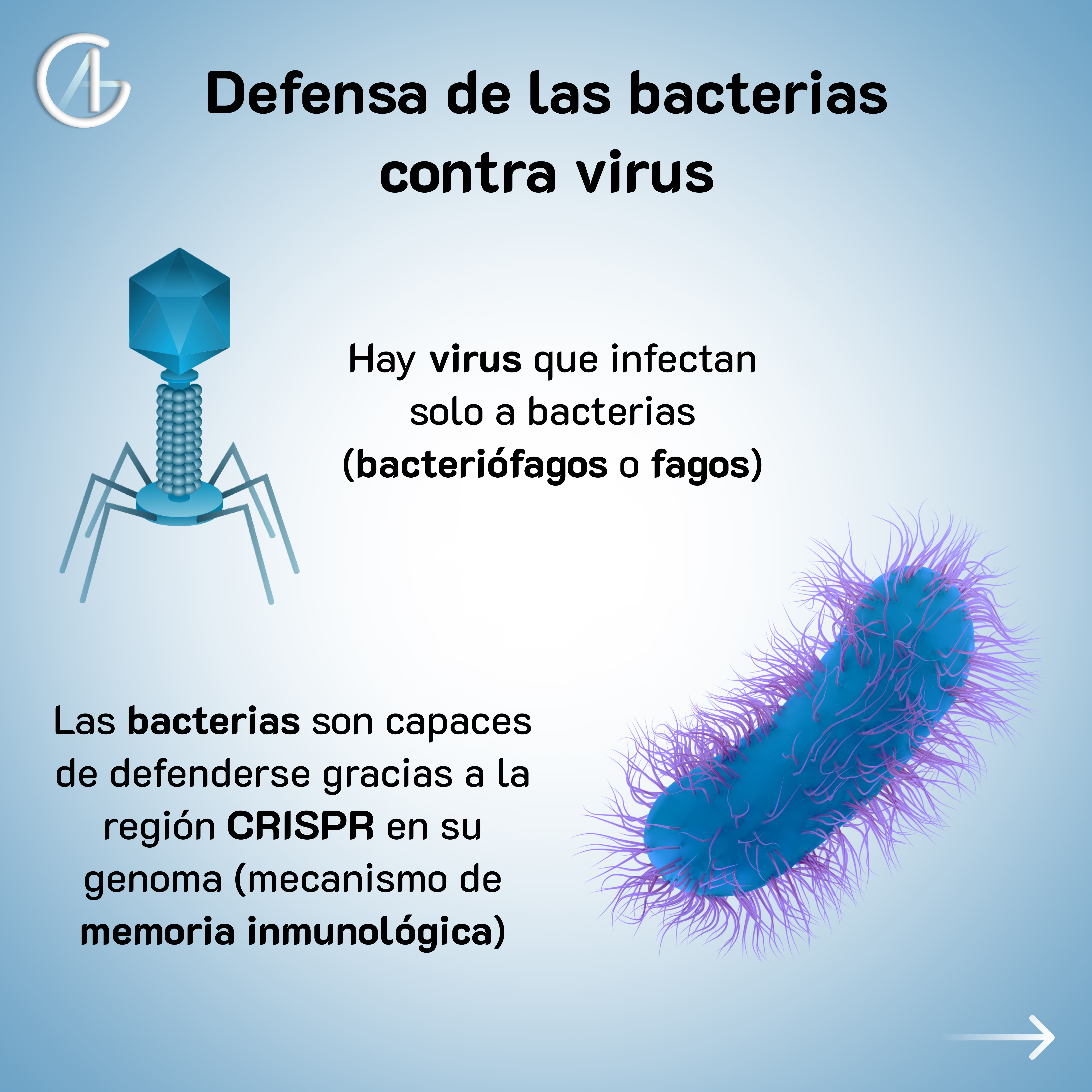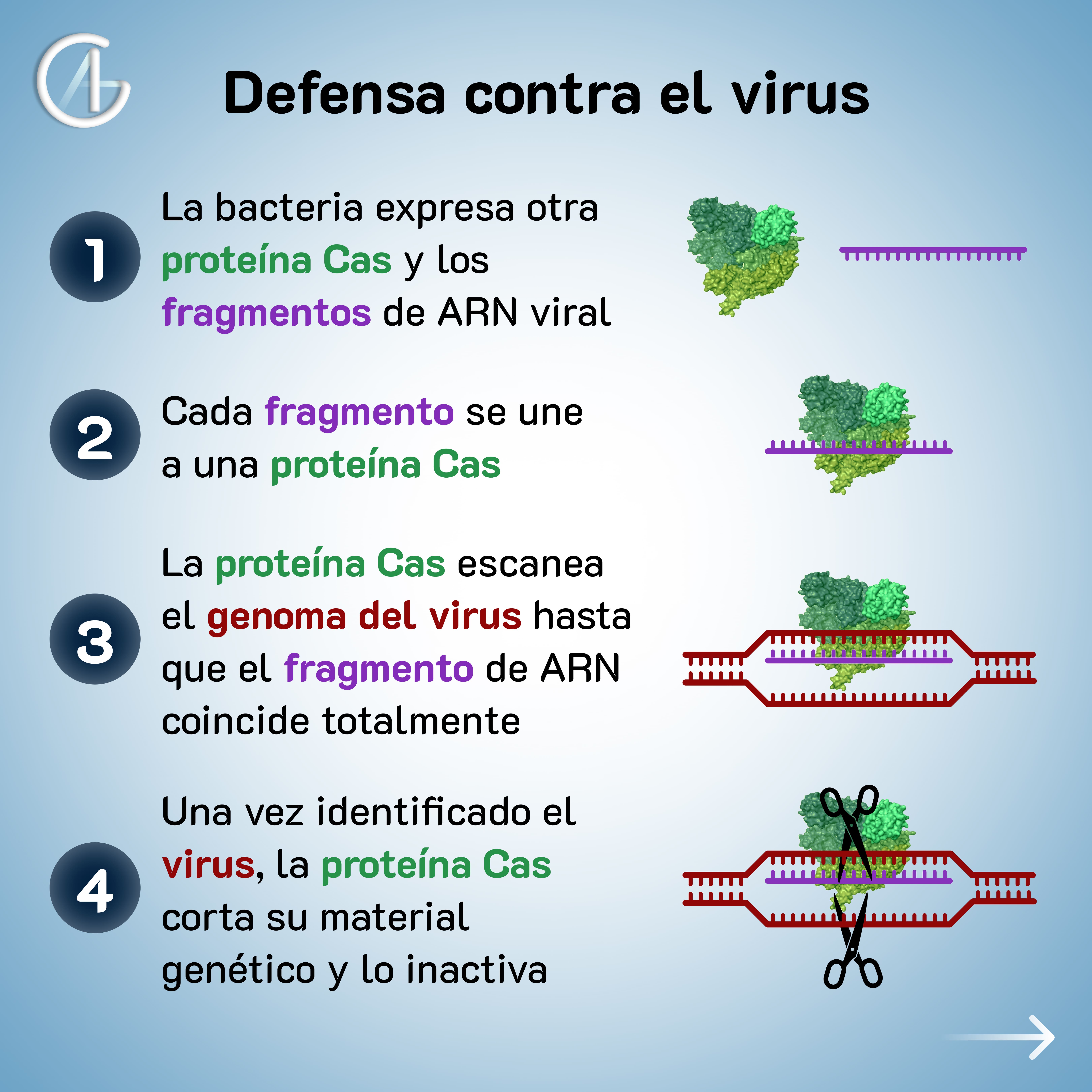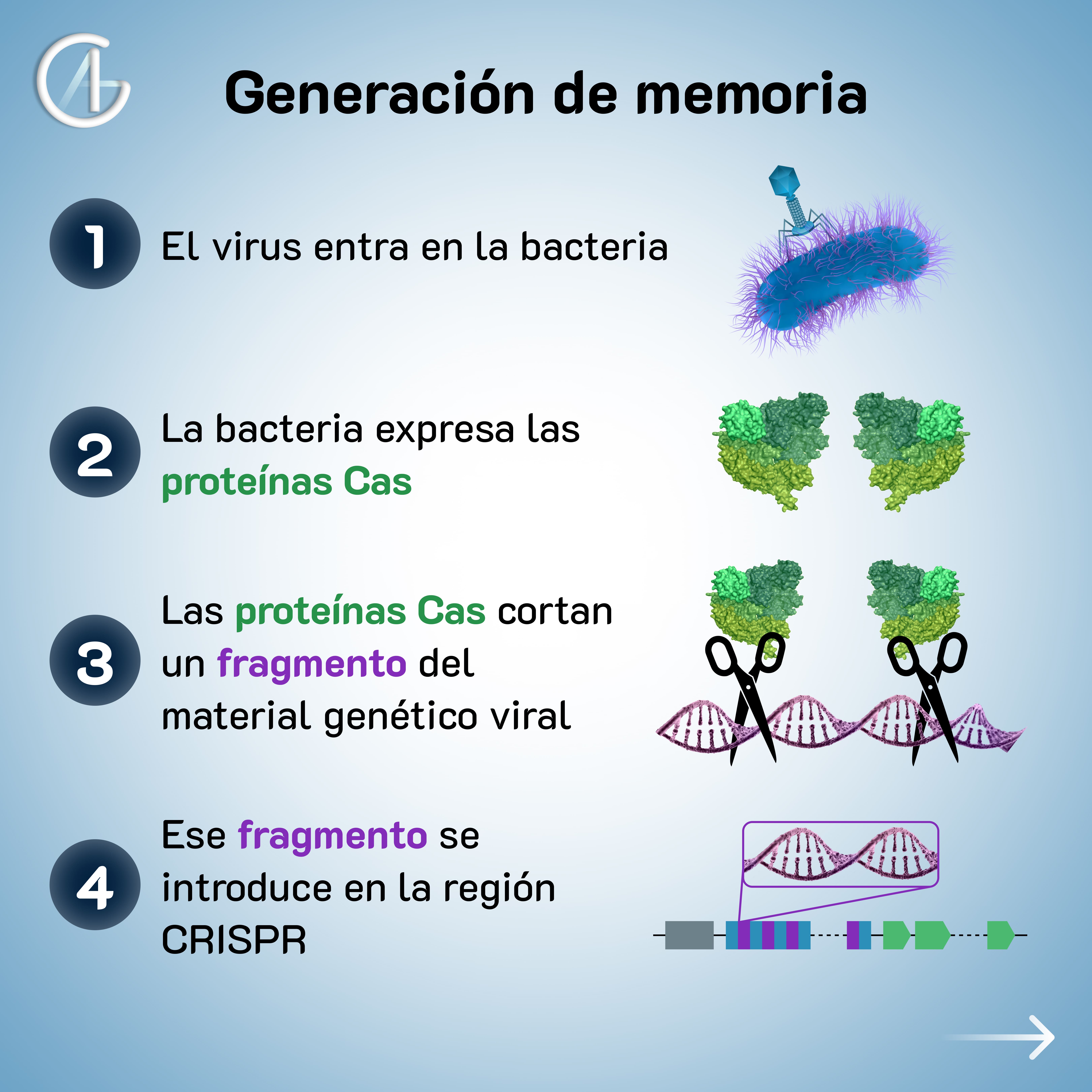 Así, la bacteria es capaz de identificar al virus (memoria) y cortar su material genético para que no pueda actuar.
