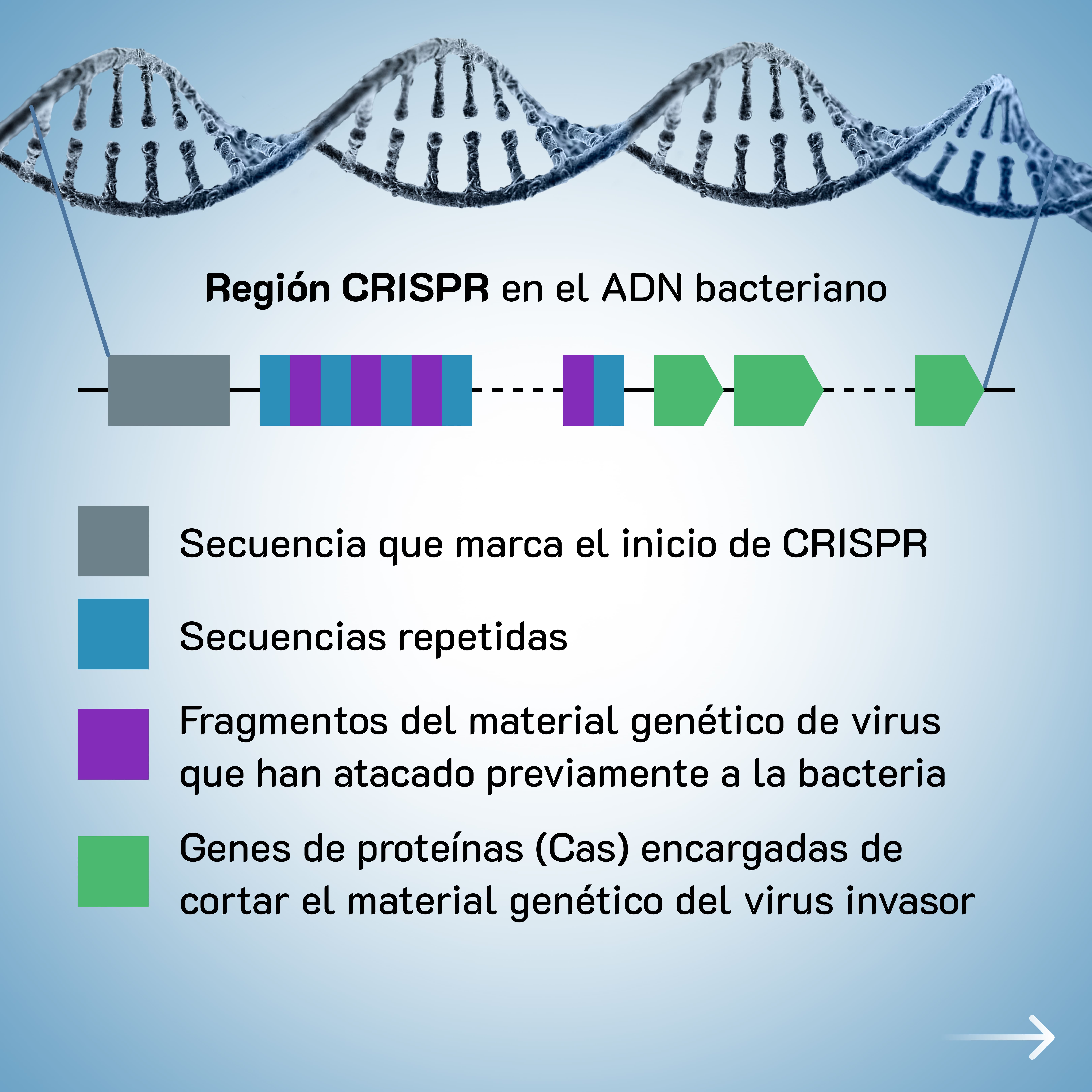 CRISPR significa "Secuencias Repetidas Palindrómicas Agrupadas y Regularmente Interespaciadas". Dicho de otra manera, secuencias de ADN repetidas y separadas por espaciadores.