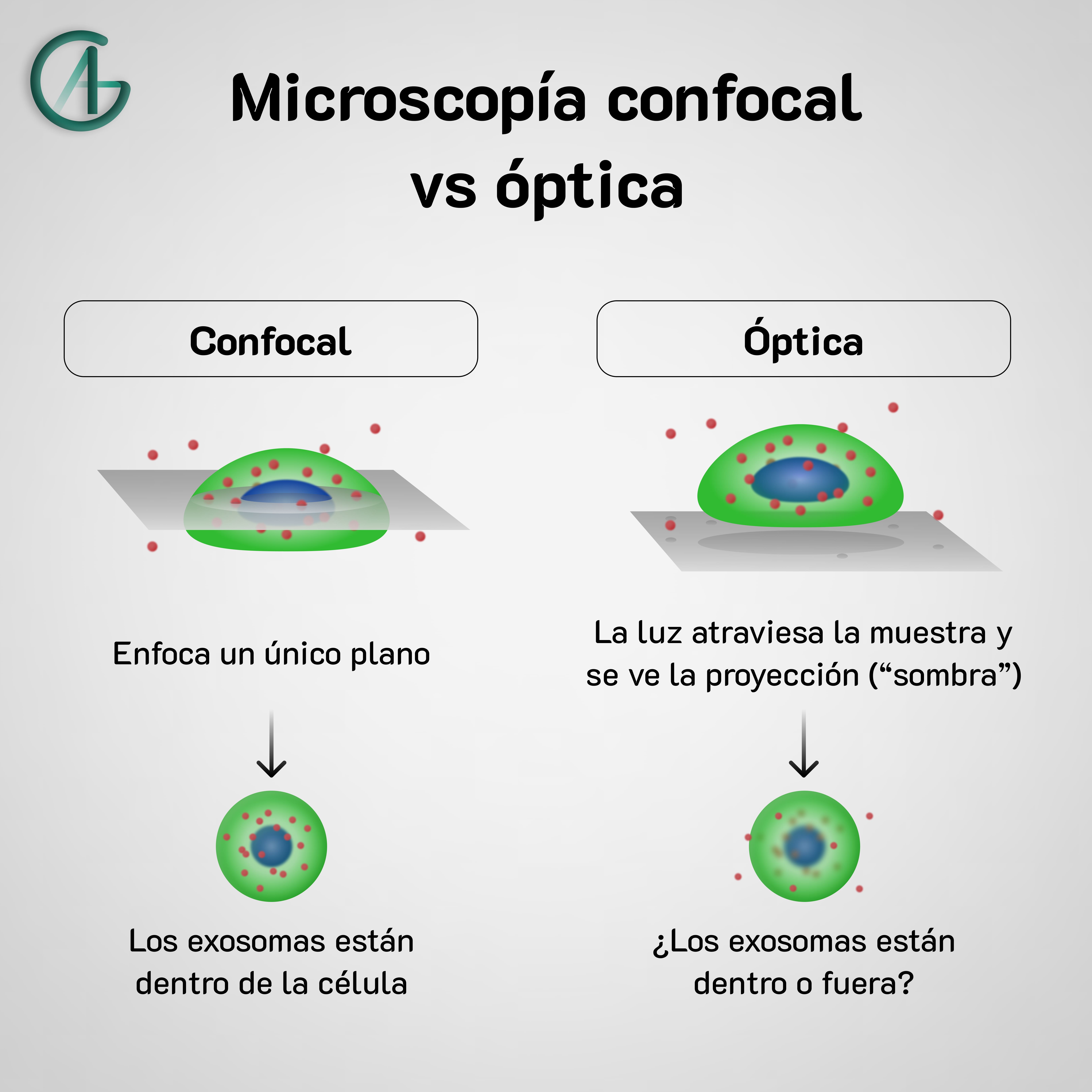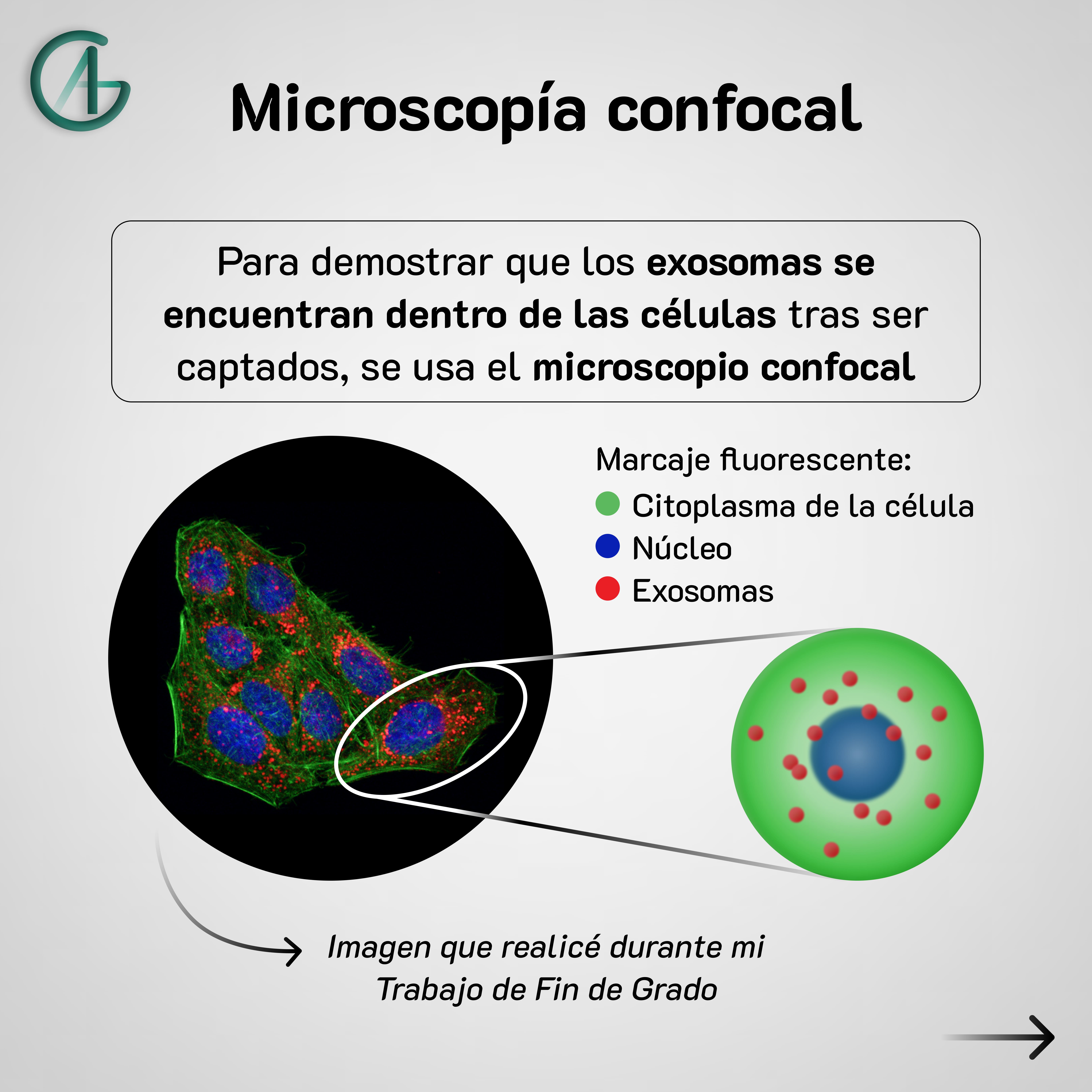 Se visualiza la muestra en el microscopio confocal, que permite ver el interior de las células y comprobar que los exosomas están dentro