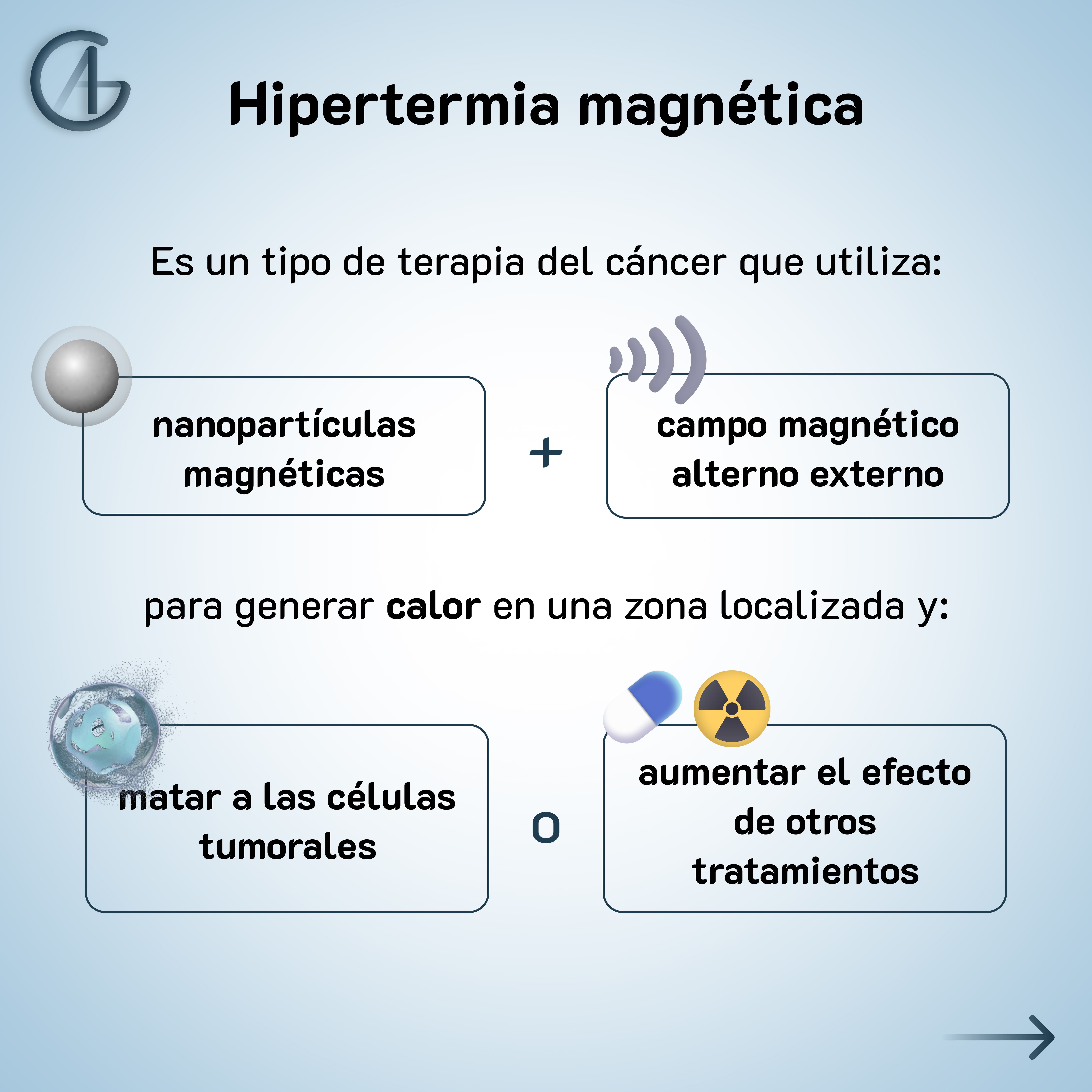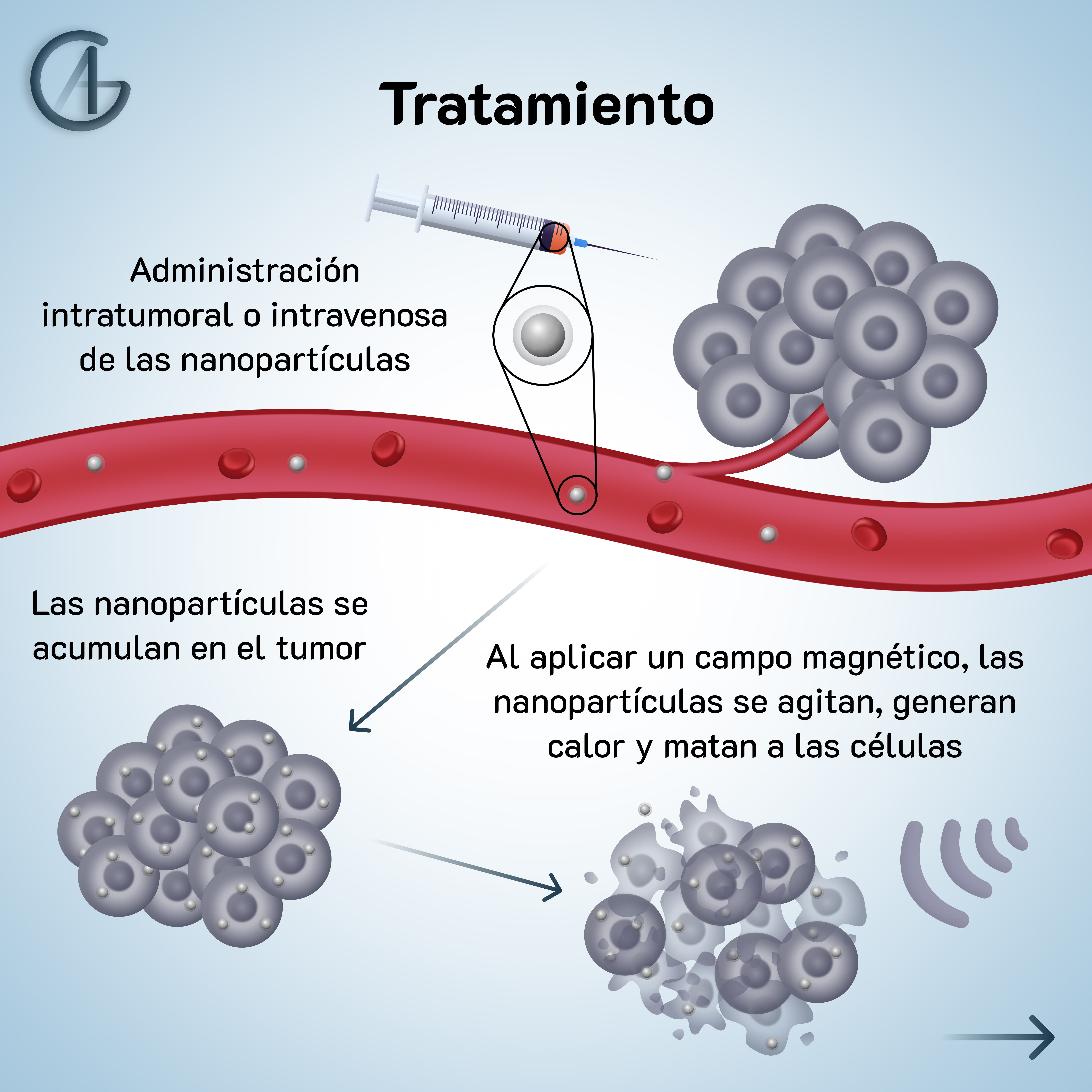Este tratamiento consiste en la administración de nanopartículas magnéticas y la posterior aplicación de un campo magnético alterno externo para aumentar la temperatura en la zona donde se acumulan las nanopartículas.