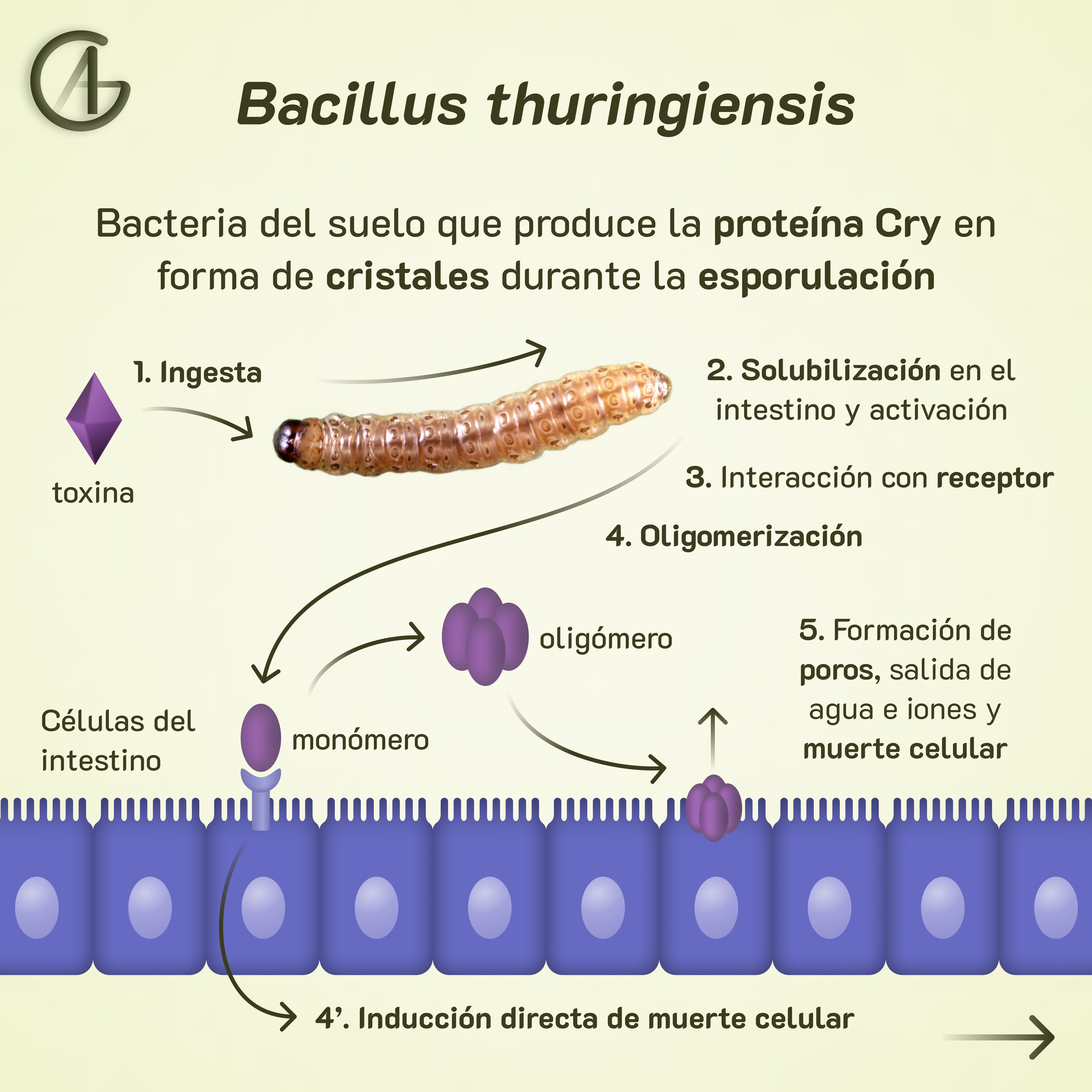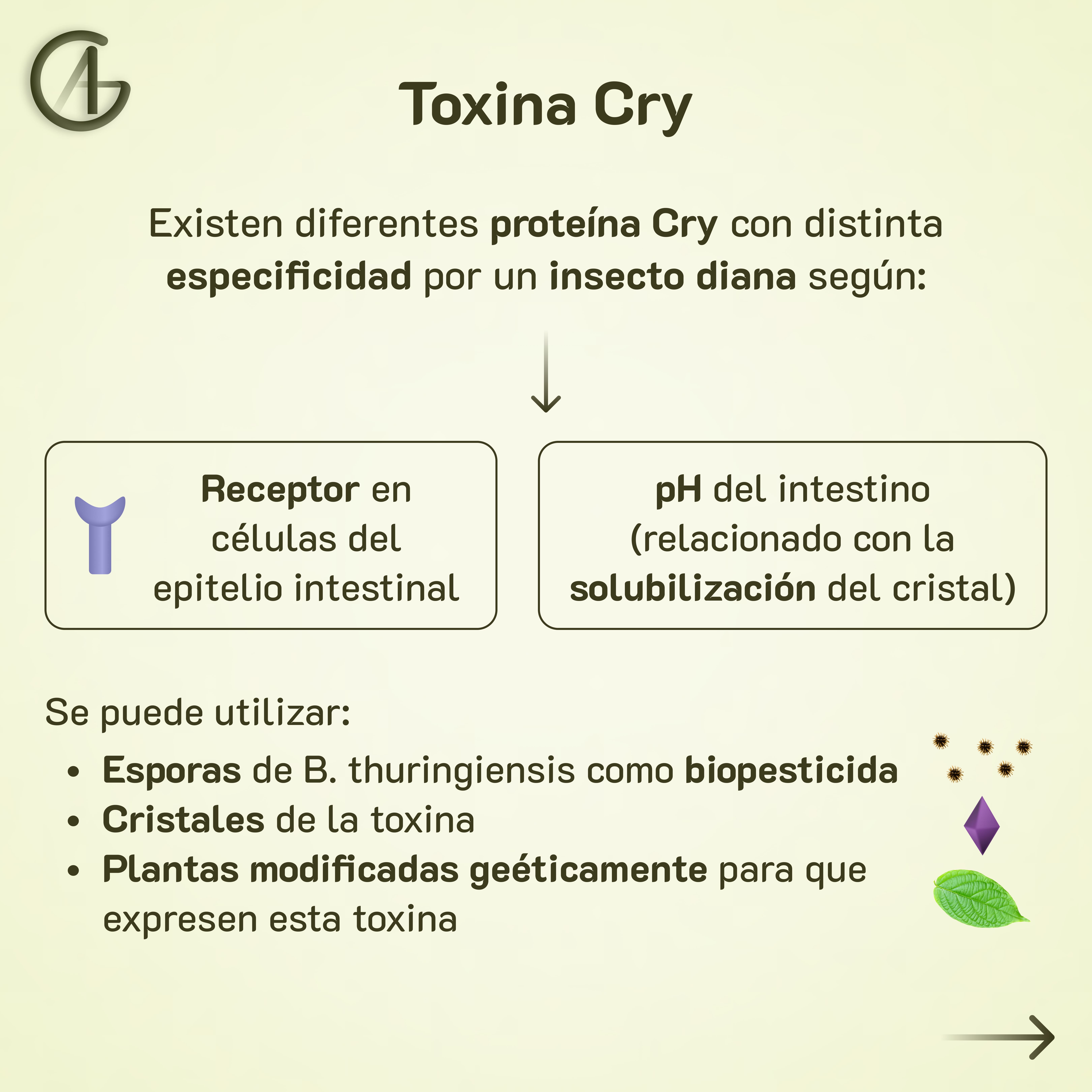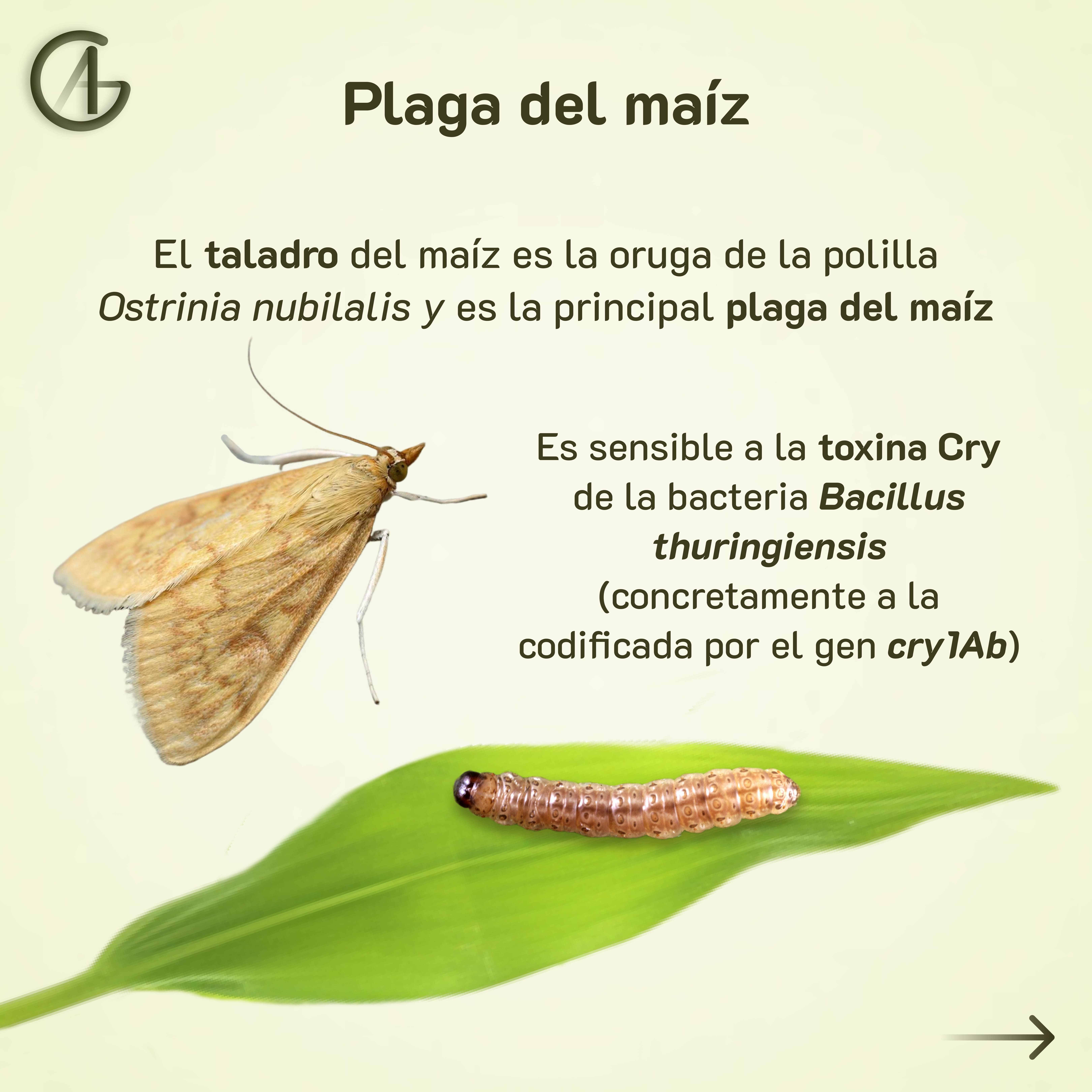 El maíz Bt es una variedad transgénica que expresa la toxina Cry de Bacillus thuringiensis. Esta toxina afecta a la principal plaga del maíz: el taladro (oruga de Ostrinia nubilalis).