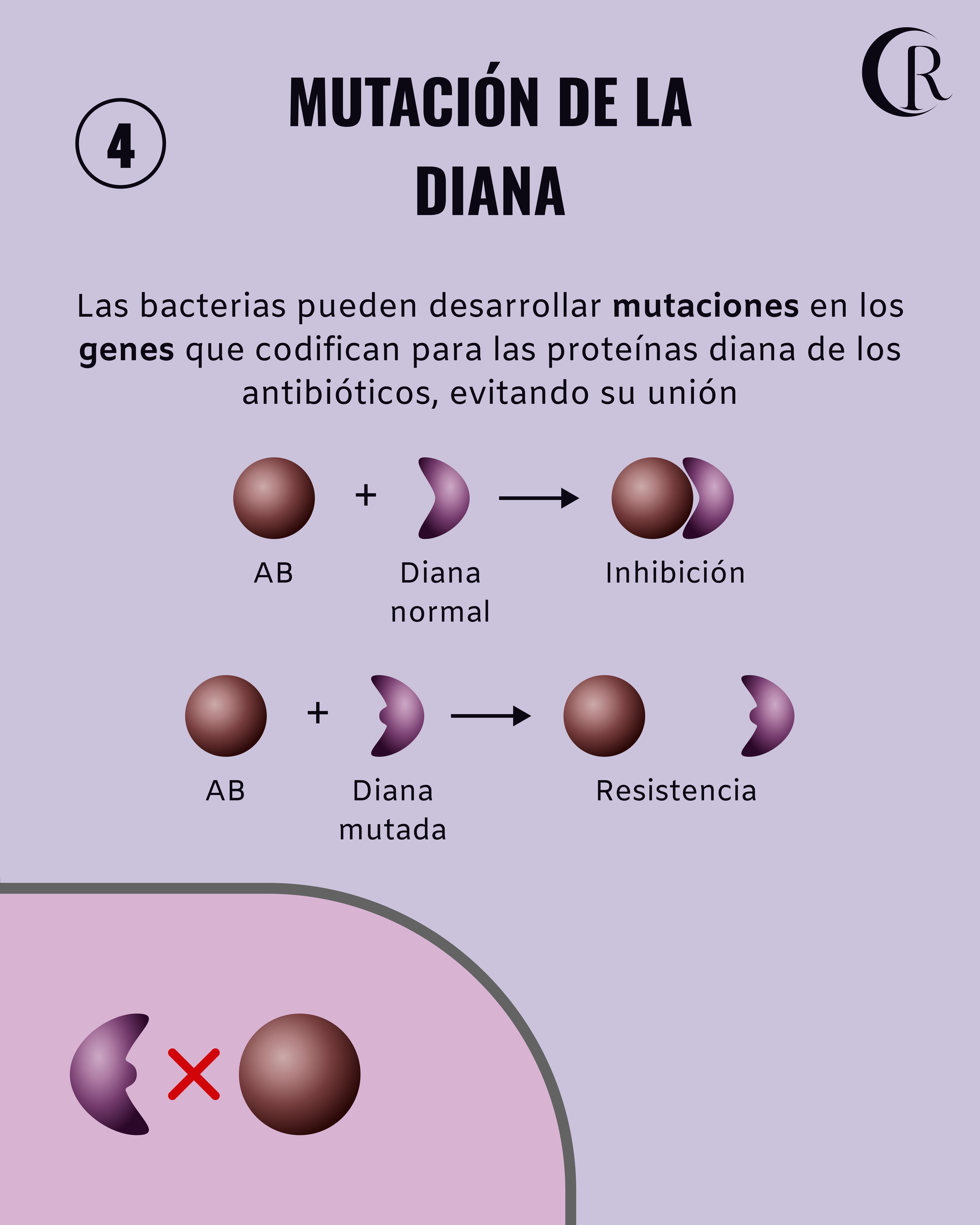 Mutación de diana: las bacterias pueden desarrollar mutaciones en los genes que codifican para las proteínas diana de los antibióticos. Estas mutaciones pueden hacer que los antibióticos no se puedan unir a las proteínas diana y, por lo tanto, no puedan funcion