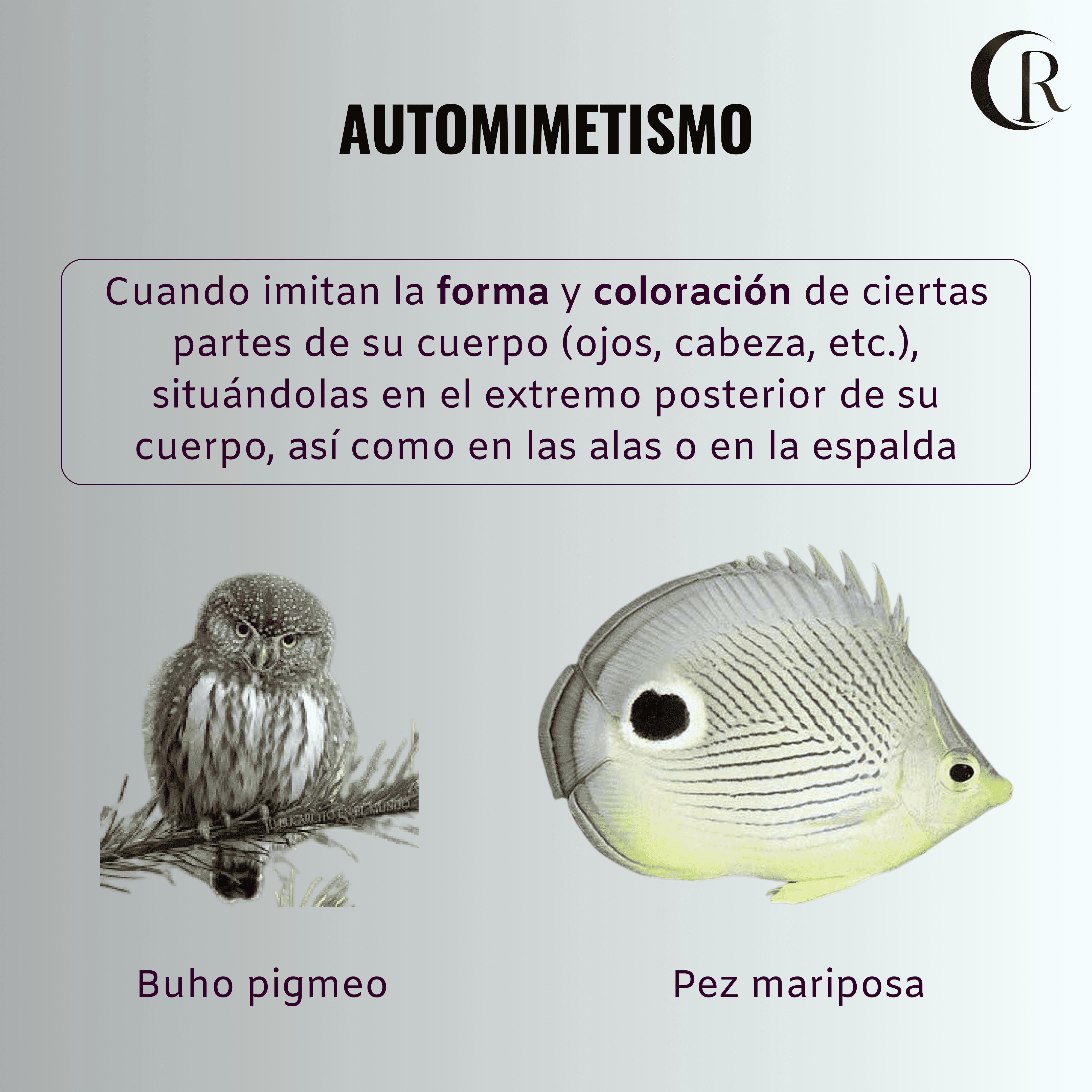 Automimetismo o mimetismo intraespecífico: es cuando los organismos optan por imitar la forma y coloración de ciertas partes de su cuerpo (ojos, cabeza, etc.), situándolas en el extremo posterior de su cuerpo, en las alas o en la espalda.