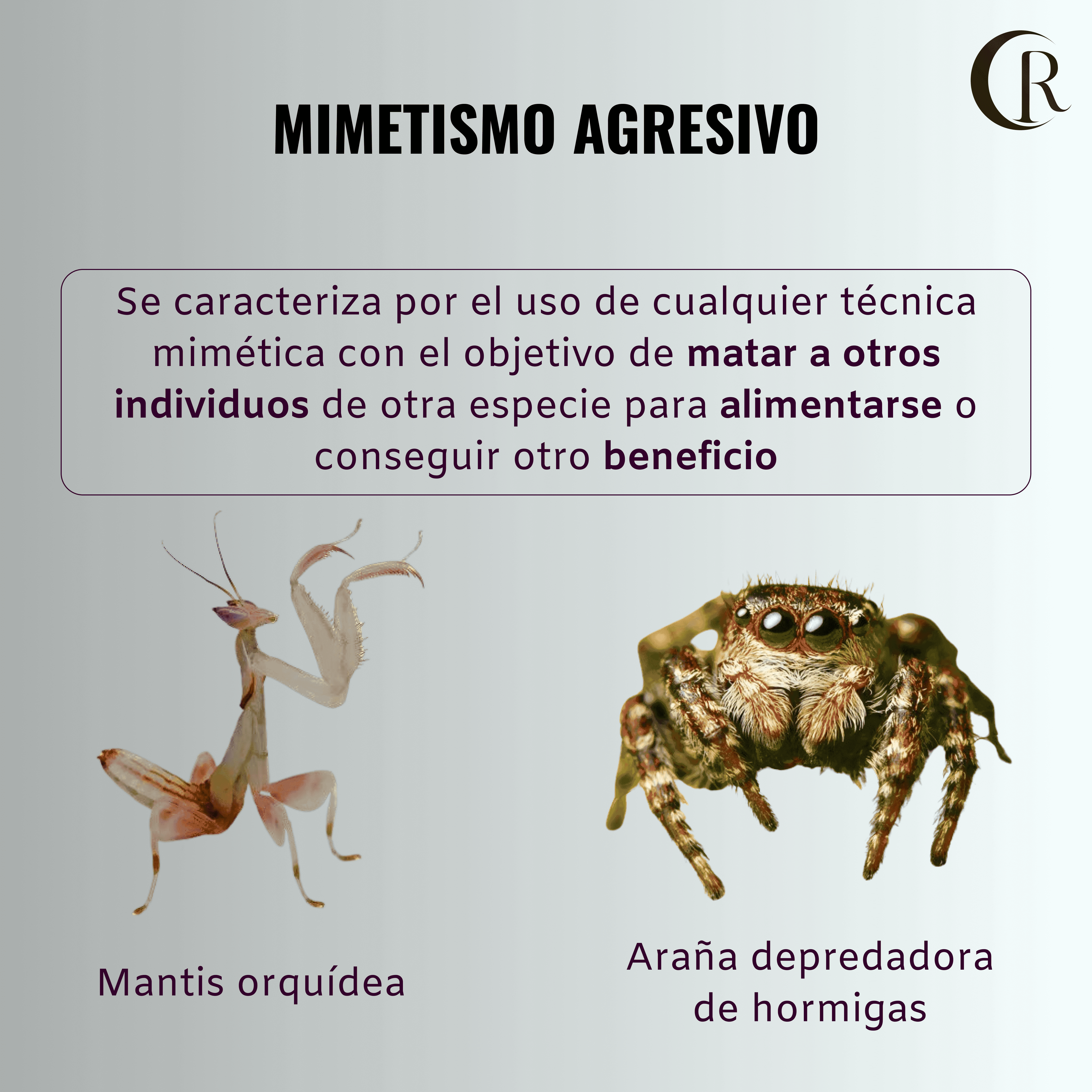 Mimetismo agresivo: se caracteriza por el uso de cualquier técnica mimética con el objetivo de matar a otros individuos de otra especie para alimentarse o para conseguir otro beneficio.