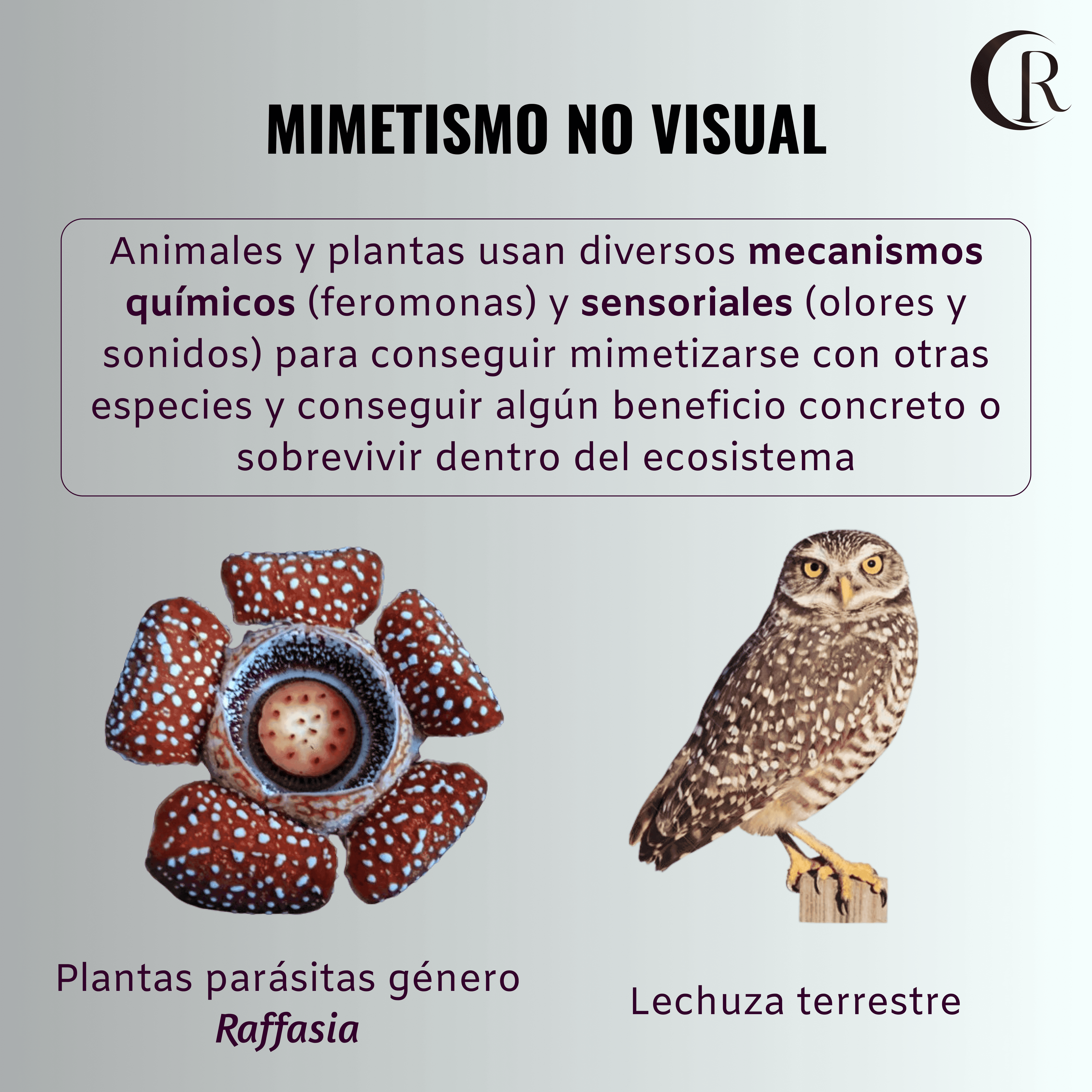 Mimetismo no visual: a veces los animales hacen uso de diversos mecanismos químicos (feromonas) y sensoriales (olores y sonidos) para conseguir mimetizarse con otras especies y conseguir algún beneficio concreto o sobrevivir dentro del ecosistema.