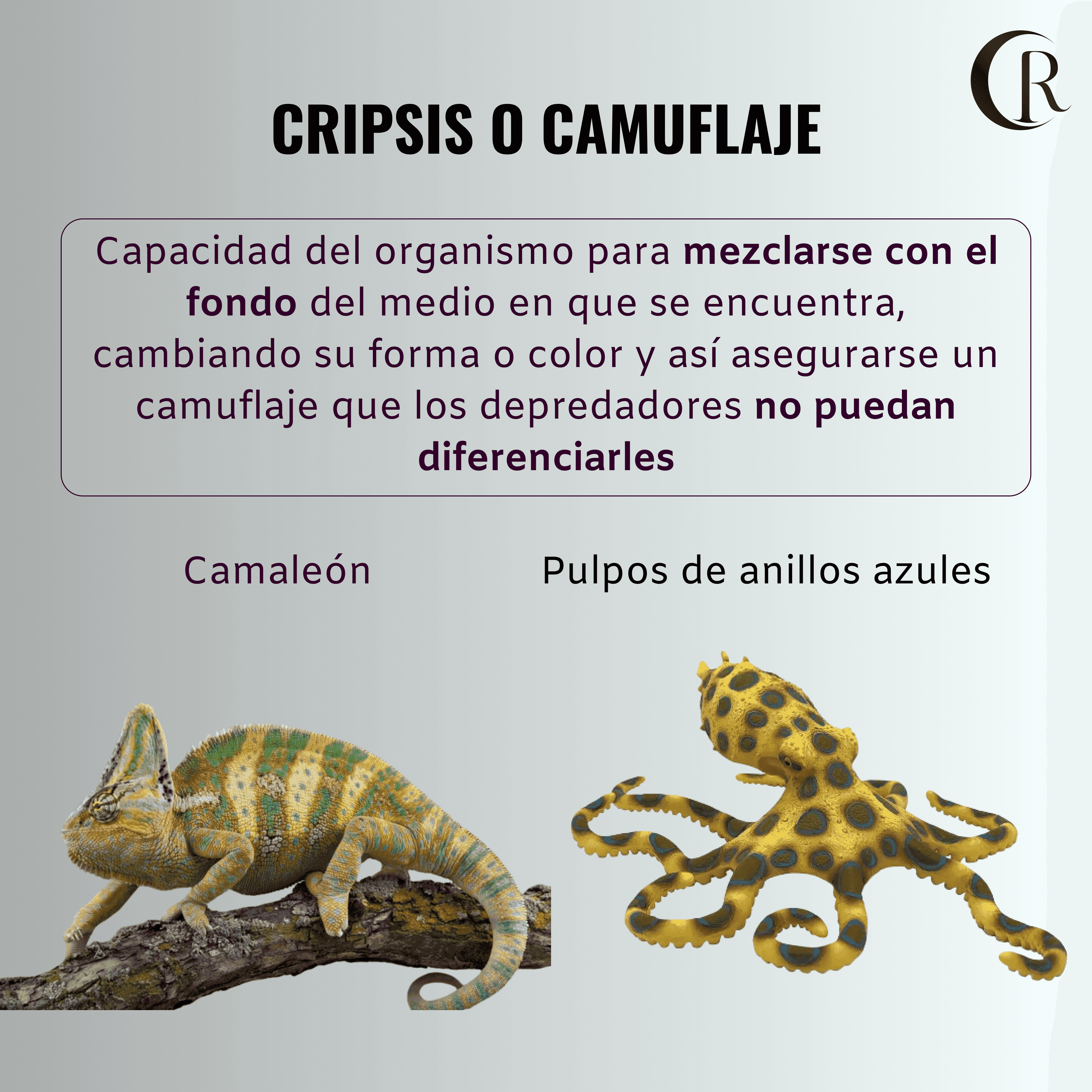 Cripsis o camuflaje: implica la capacidad del organismo para mezclarse con el fondo del medio en que se encuentra, cambiando para ello su forma o color para asegurarse un camuflaje más efectivo y que los depredadores no sean capaces de diferenciarles.