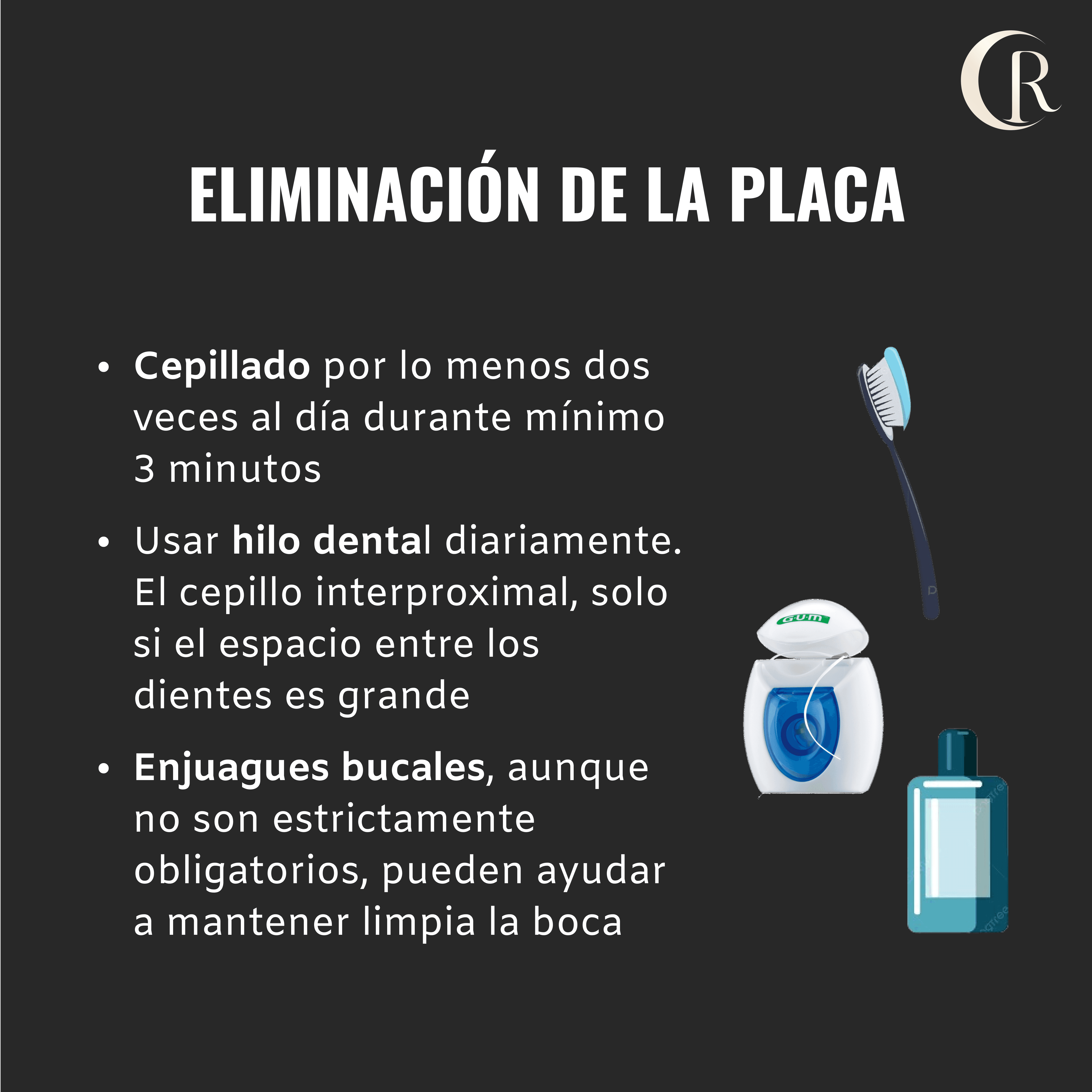 Usar hilo dental diariamente para retirar la placa que se forma entre diente y diente, ya que el cepillo no alcanza esta zona. Usar cepillo interproximal, sólo si el espacio entre los dientes es grande.