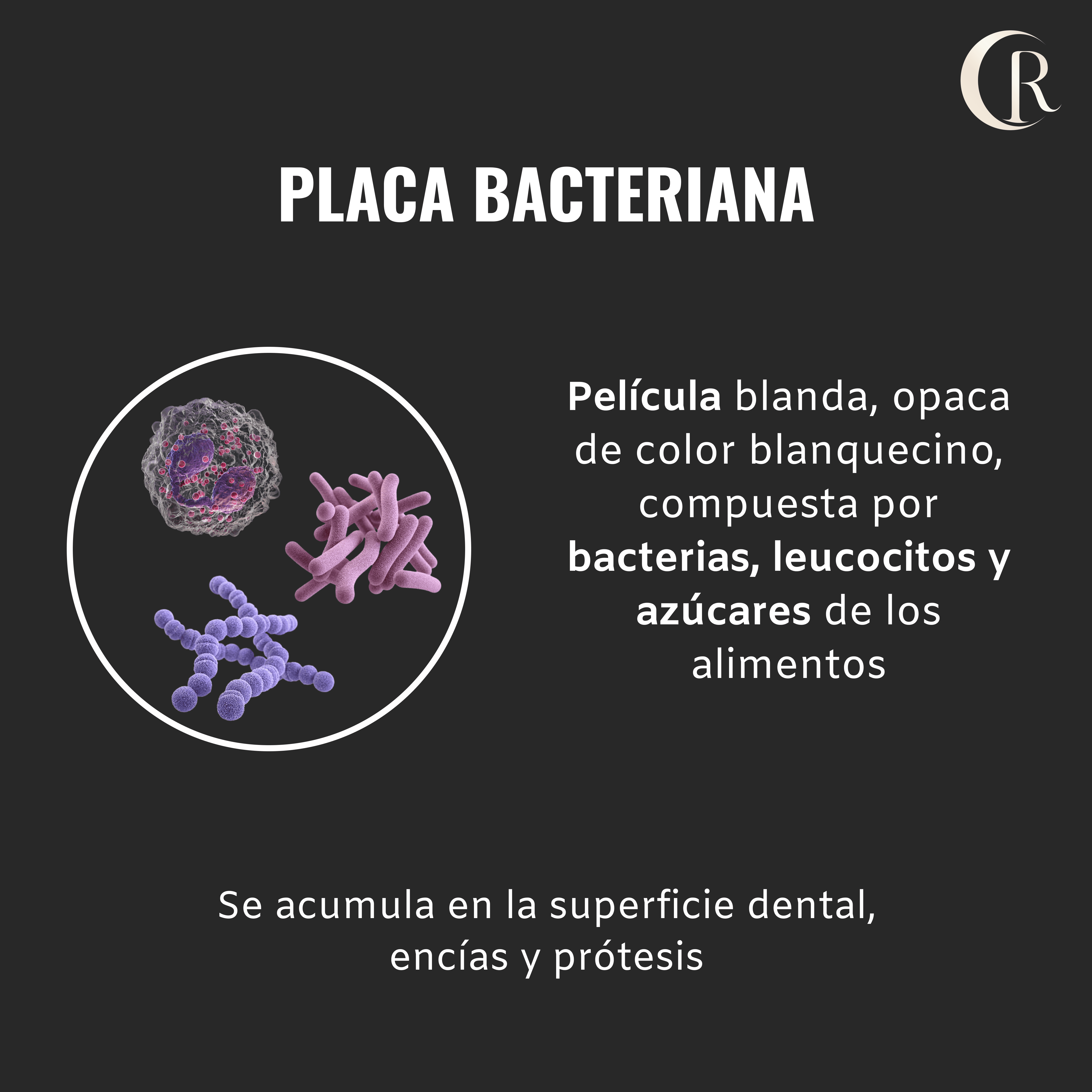 La placa bacteriana es una película de consistencia blanda, opaca y de color blanquecino, compuesta por bacterias, leucocitos y azúcares provenientes de los restos de alimentos que no se han eliminado.