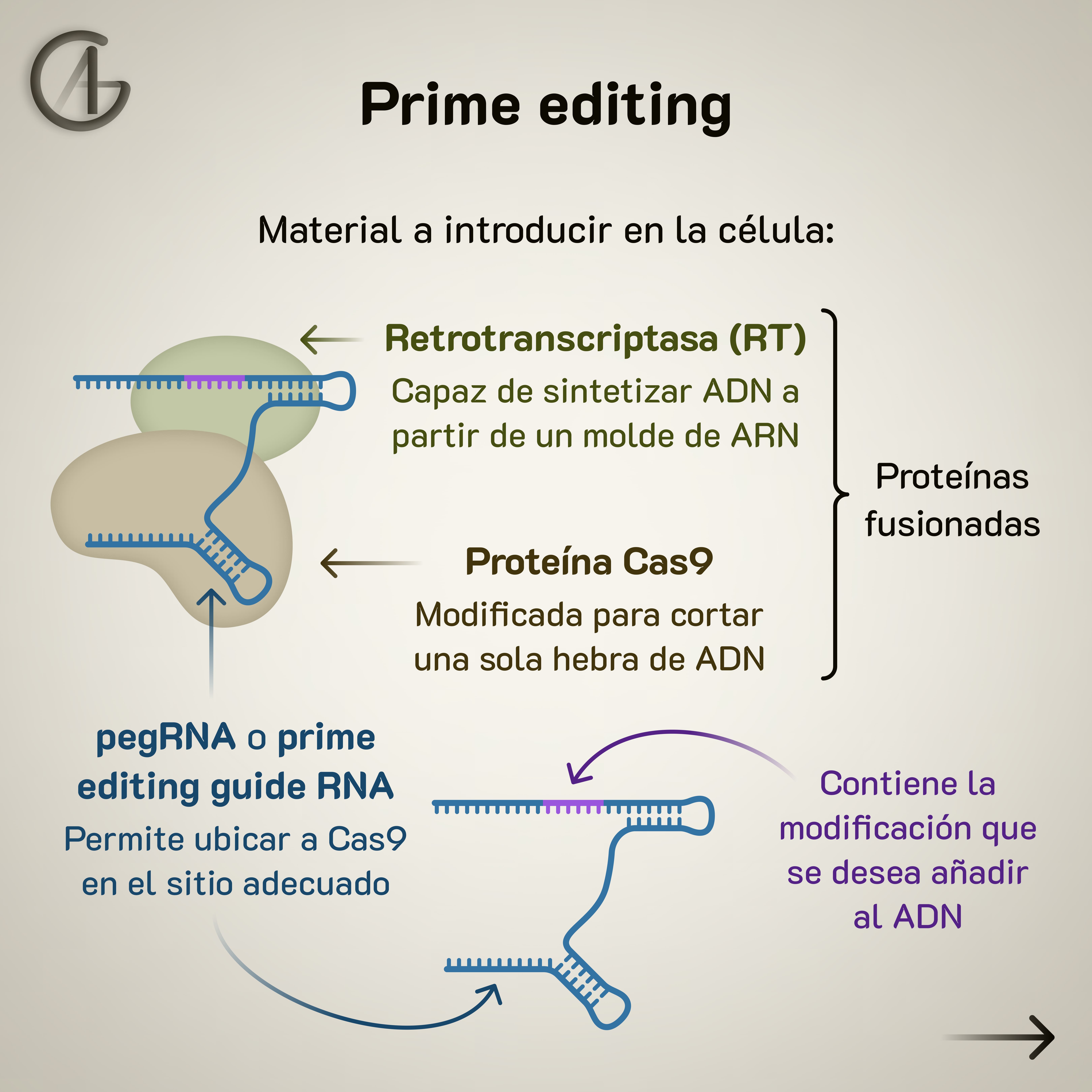 En vez de usar la proteína Cas9 (que corta las dos hebras de ADN) se usó la versión nickasa de Cas9 (que solo corta una hebra) fusionada con una retrotranscriptasa, cuya función es convertir ARN en ADN.