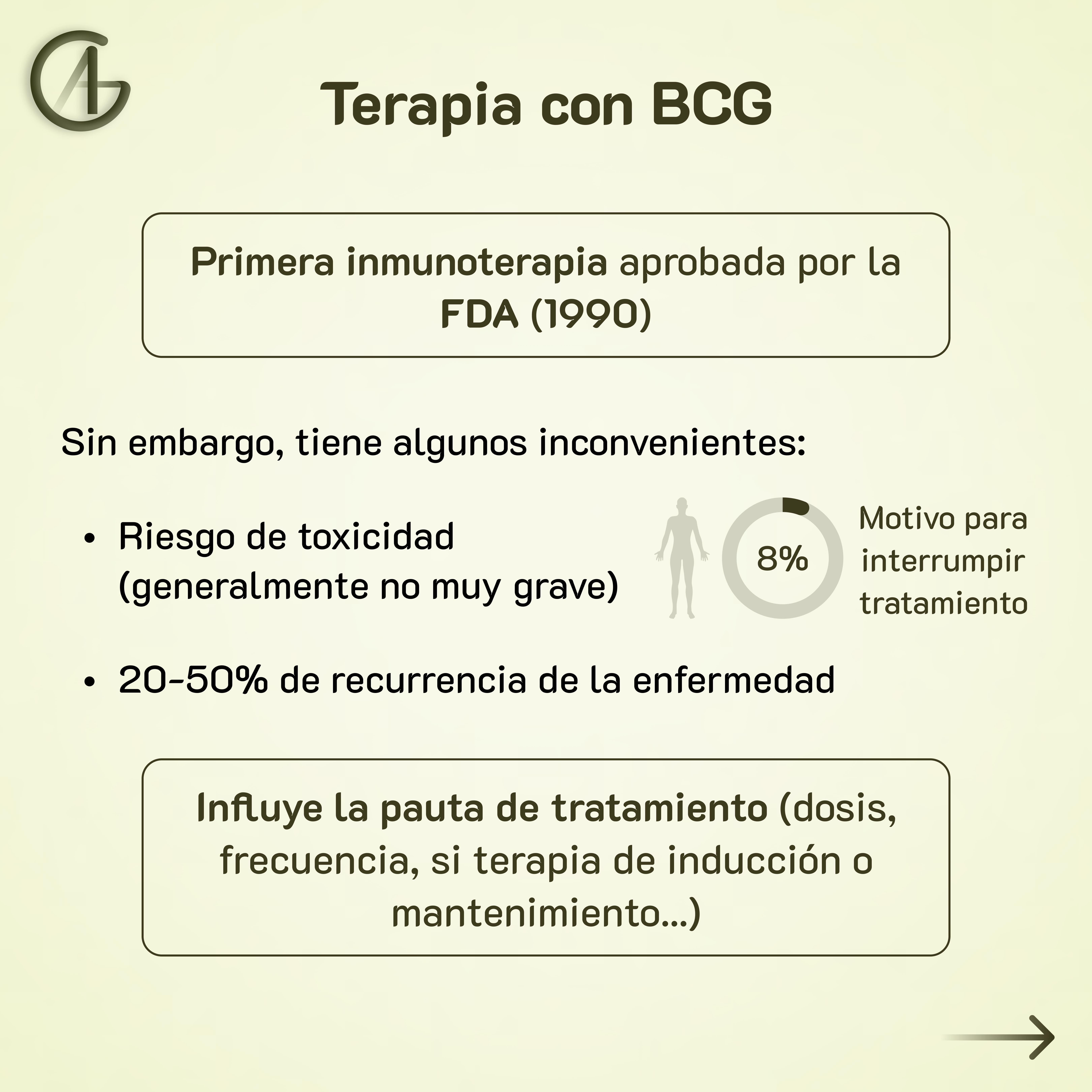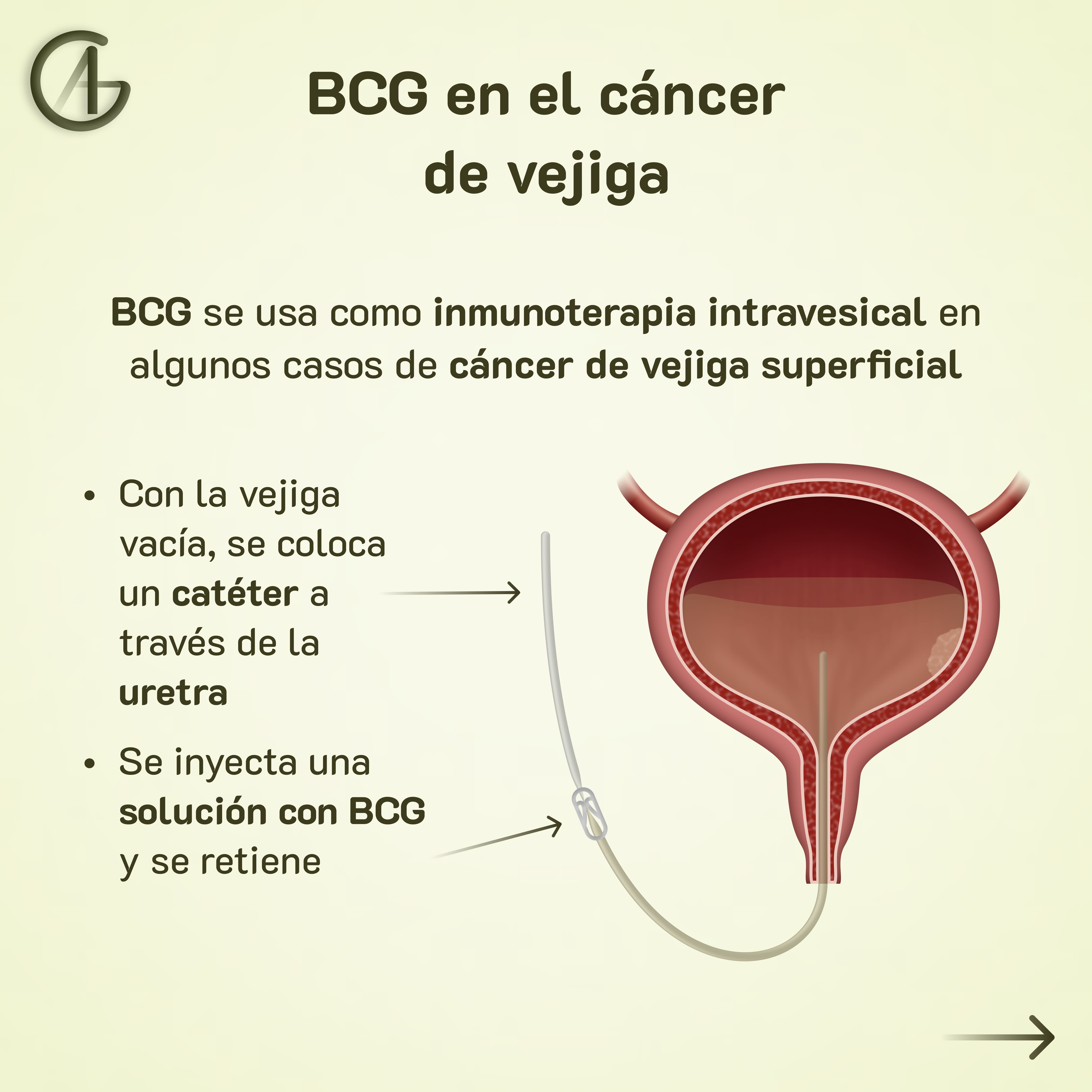 Desde su aprobación por la FDA en 1990, se usa BCG como inmunoterapia en el tratamiento del cáncer de vejiga en estadio temprano. Concretamente, se realiza un lavado de la vejiga con una solución que contiene BCG administrada a través de un catéter introducido por la uretra.