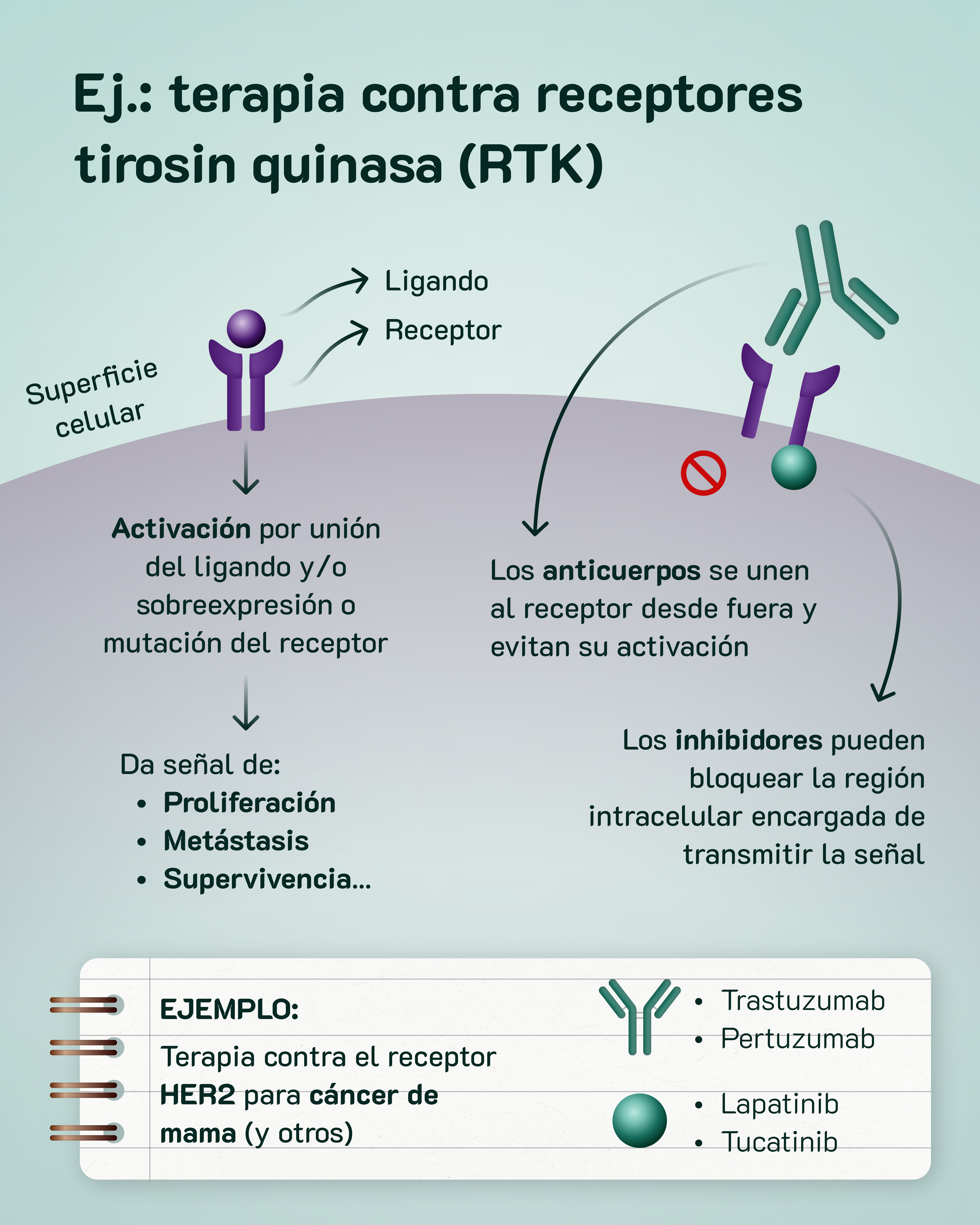 Se pueden diseñar anticuerpos o moléculas pequeñas (inhibidores) capaces de unirse específicamente a estas proteínas, impidiendo que den esa señal de proliferación, supervivencia, etc.