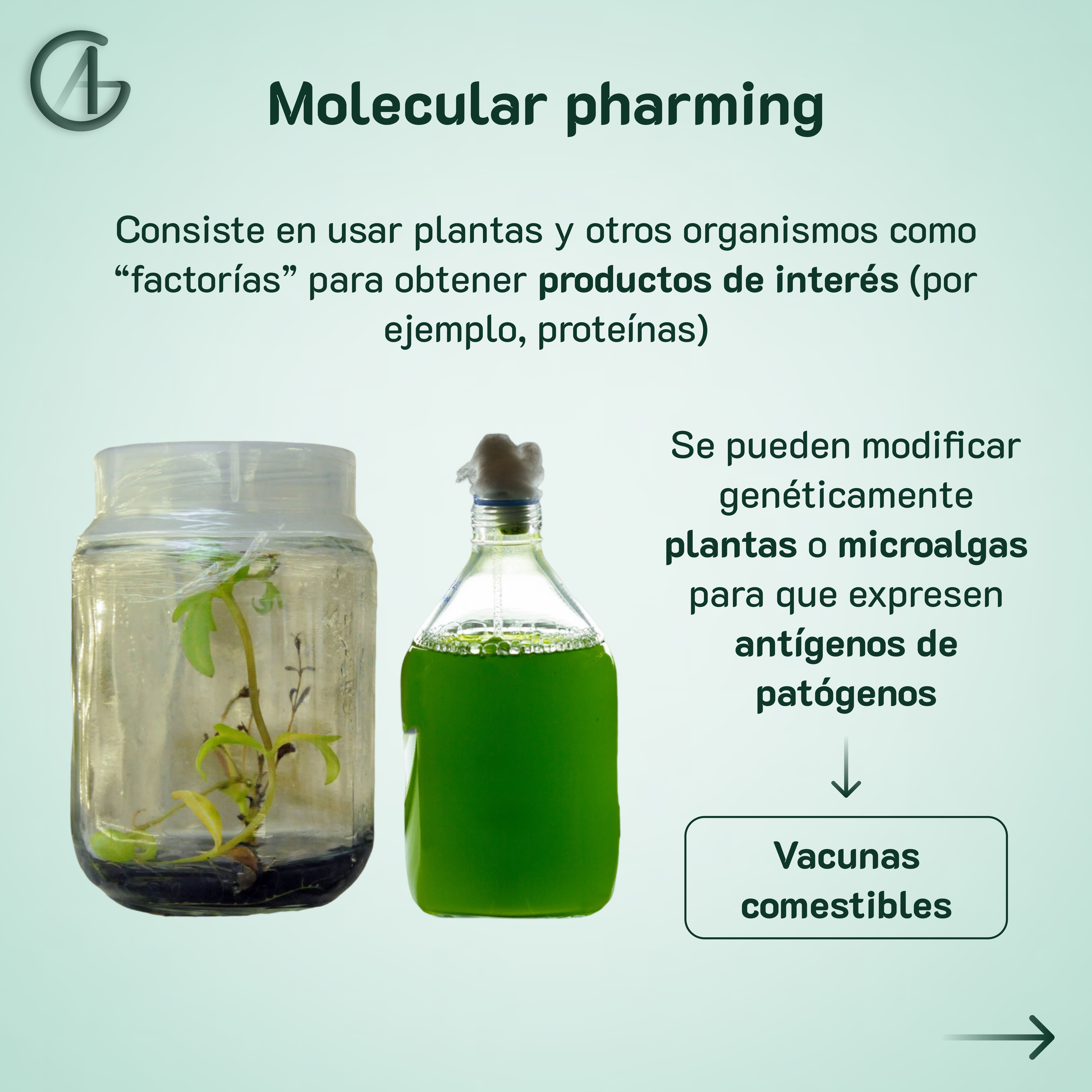 Estas últimas son un ejemplo de “molecular pharming”, que consiste en obtener productos de interés mediante plantas principalmente. En este caso, lo que se consigue es que plantas o microalgas expresen antígenos de patógenos que permitan la inmunización al ser ingeridos.