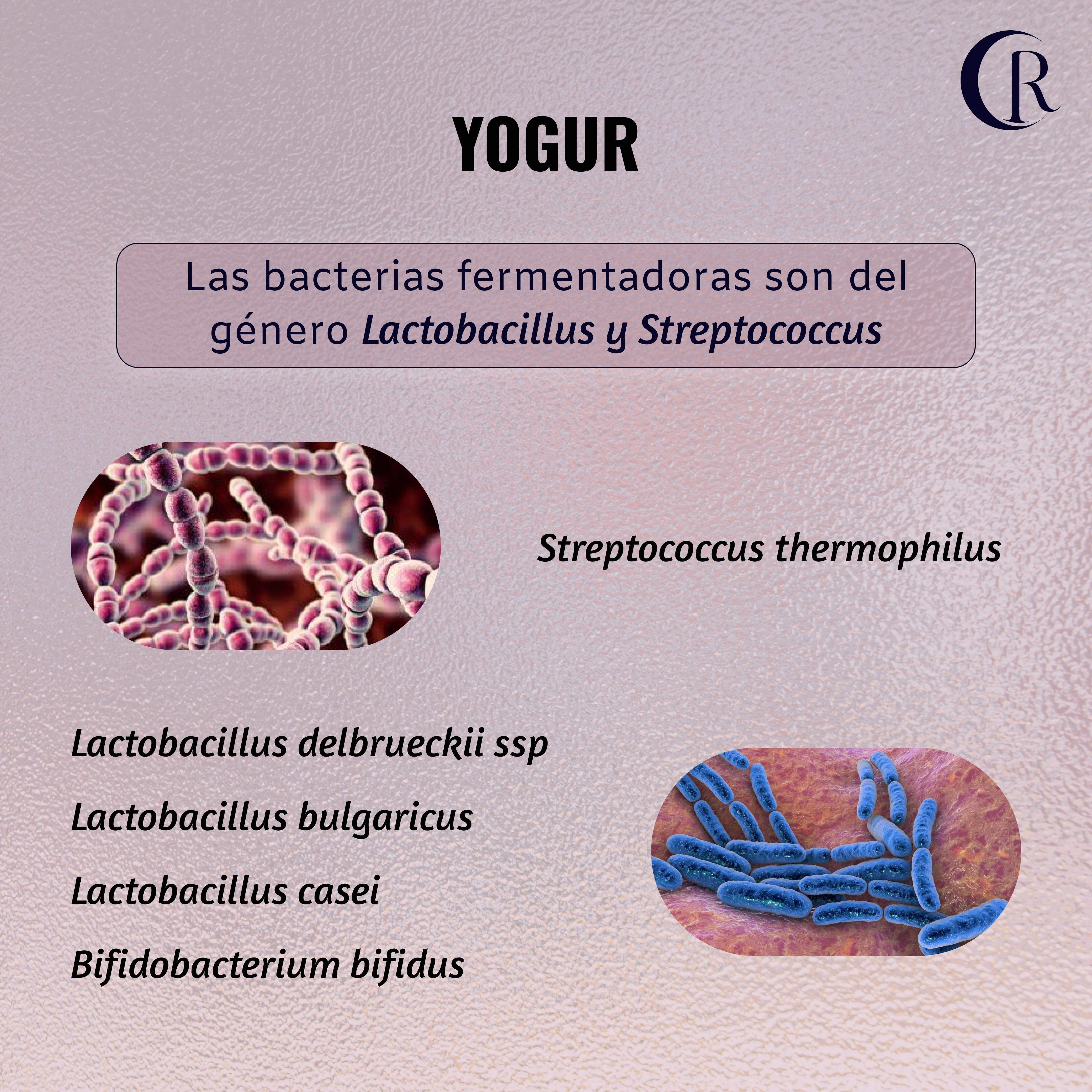 El yogur es un producto lácteo que se obtiene mediante la fermentación de la leche por acción de bacterias de los géneros Lactobacillus y Streptococcus.